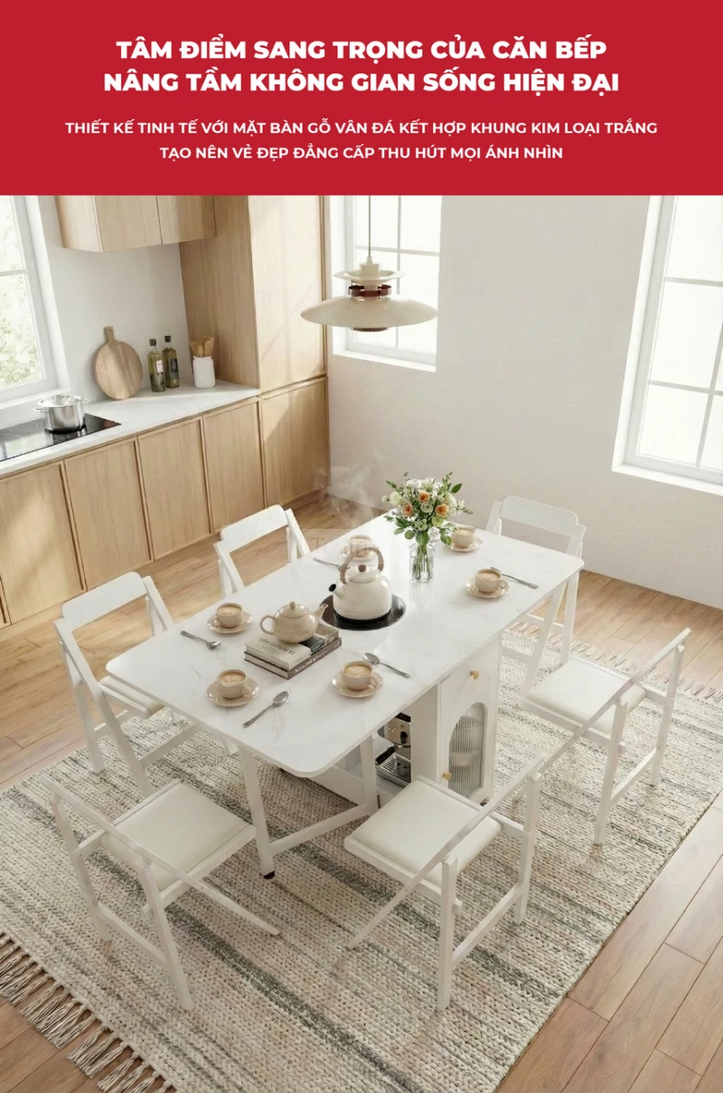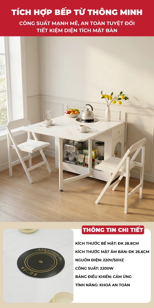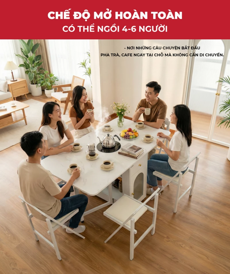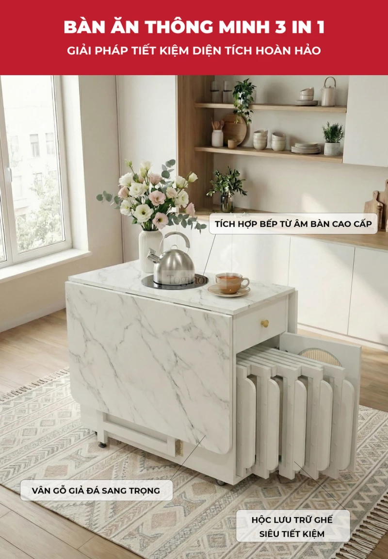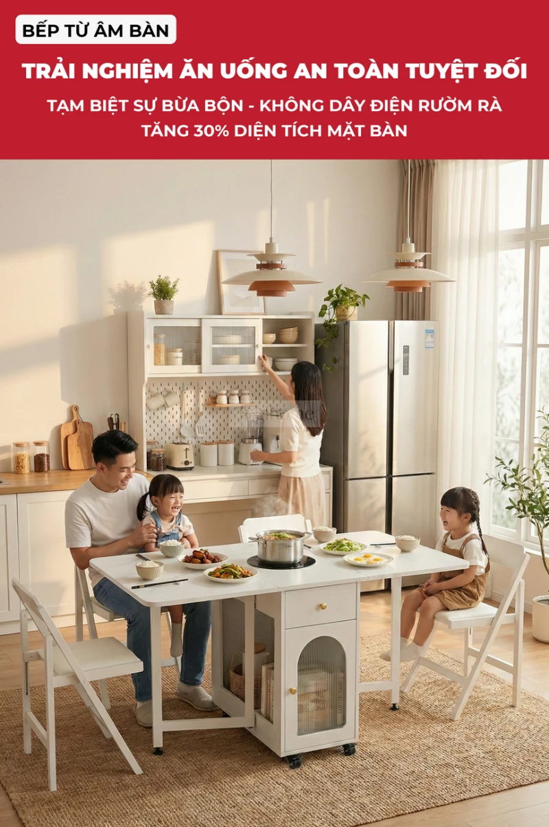 Bàn Ăn Đa Năng Tích Hợp Bếp Lẩu BA709 – Gấp Gọn Thành Tủ, Mở Rộng Tiệc 8 Người, Di Chuyển Dễ Dàng