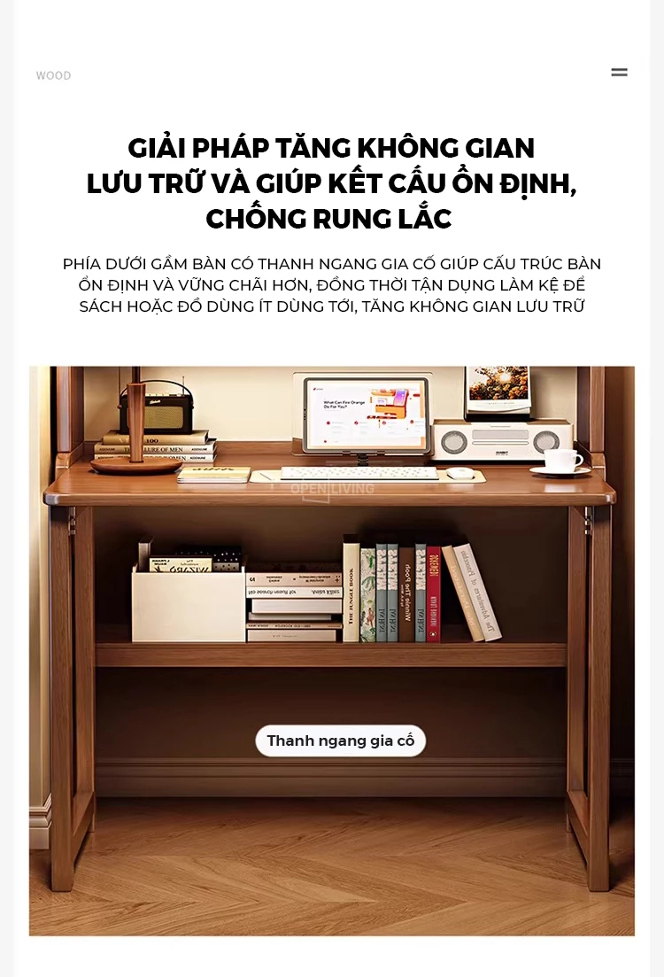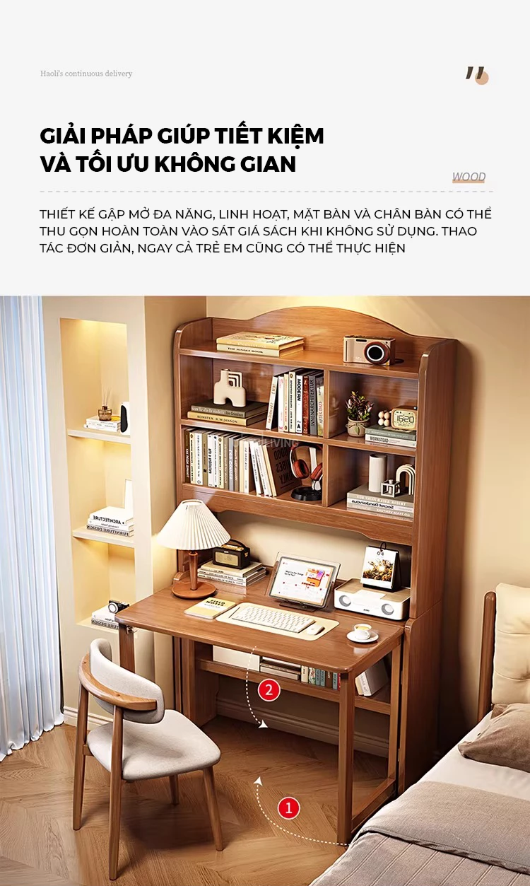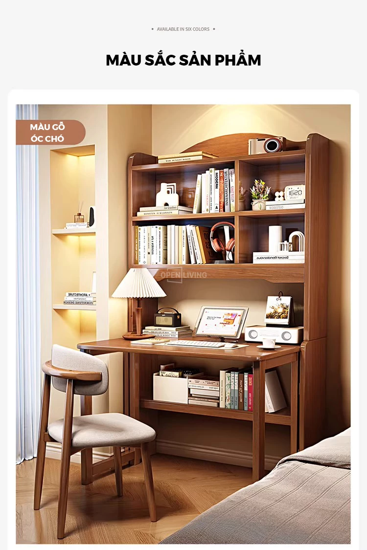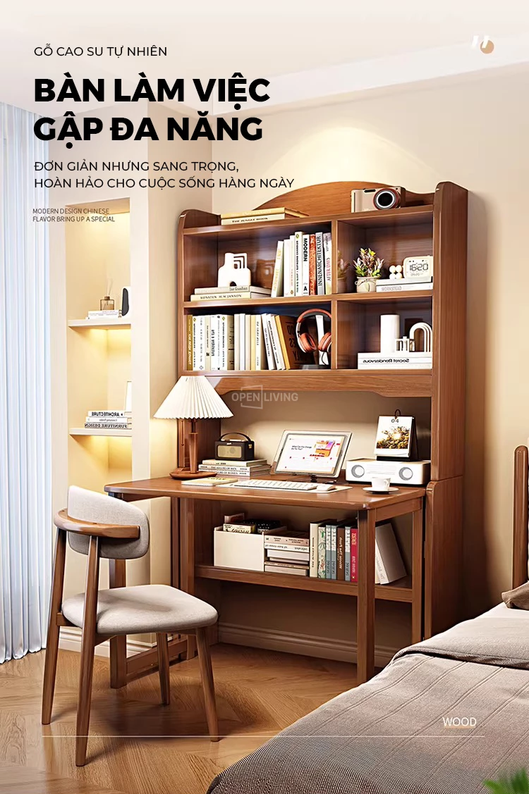 Bàn Học Gỗ Tự Nhiên Cao Cấp Openliving BLM364 – Bàn Gấp Kèm Kệ Sách, Chắc Chắn, Tiết Kiệm Diện Tích Căn Hộ Nhỏ
