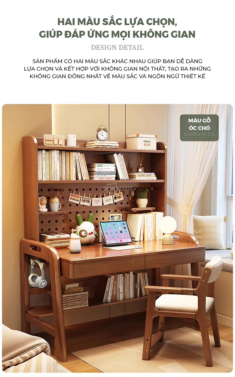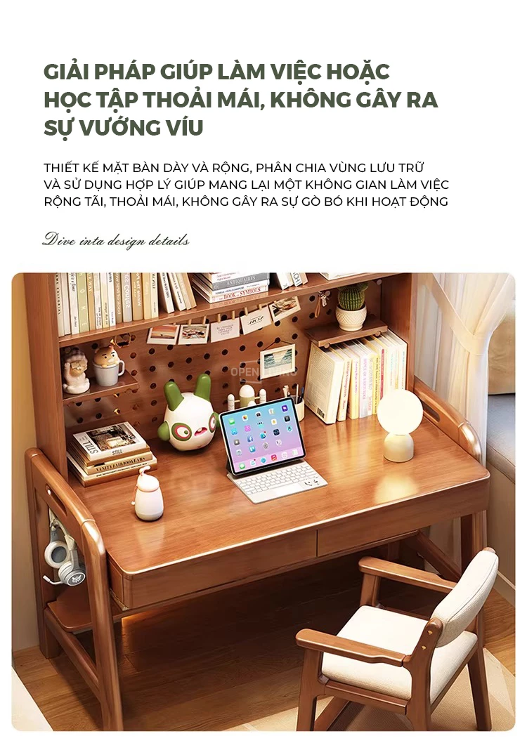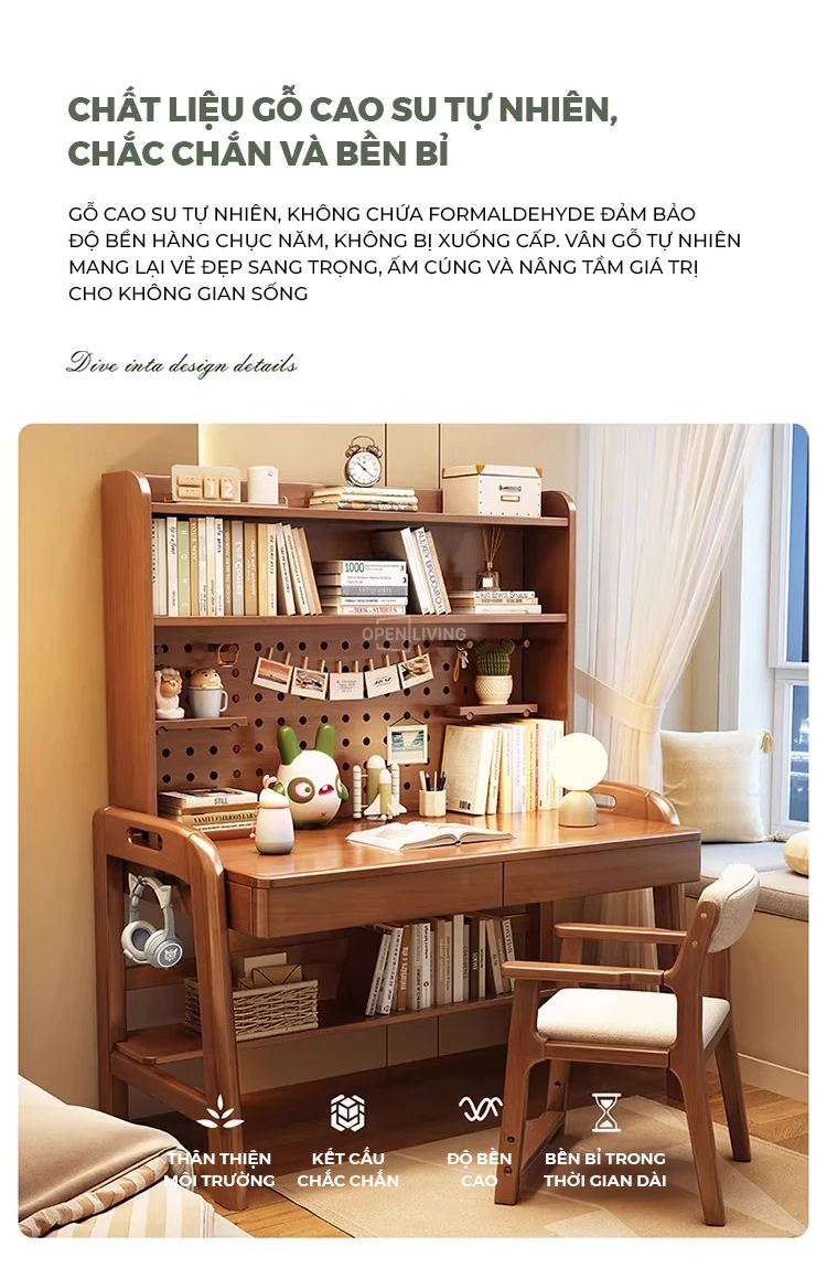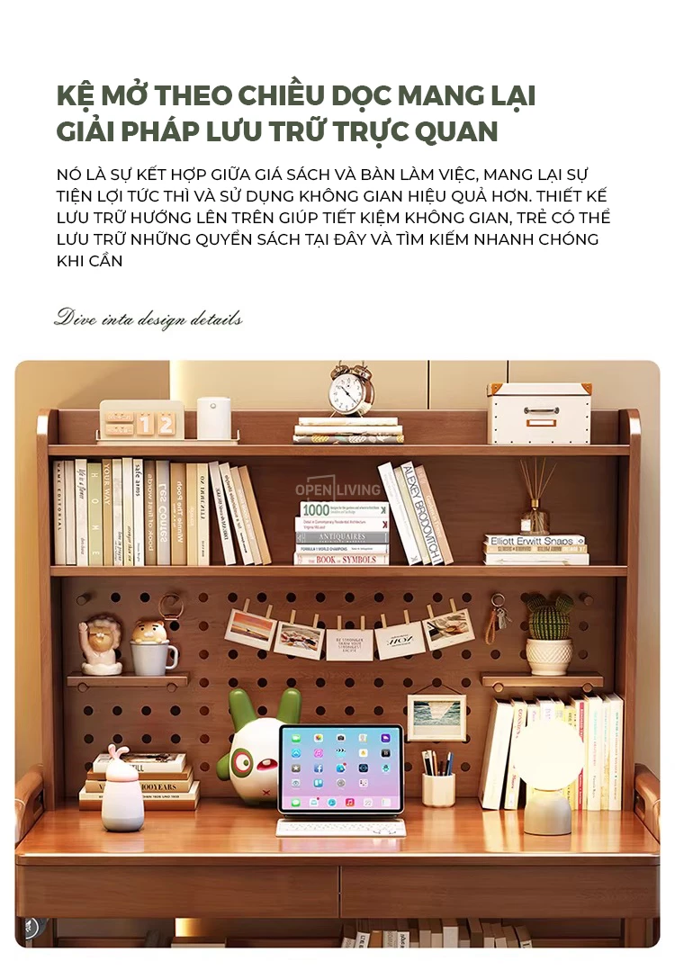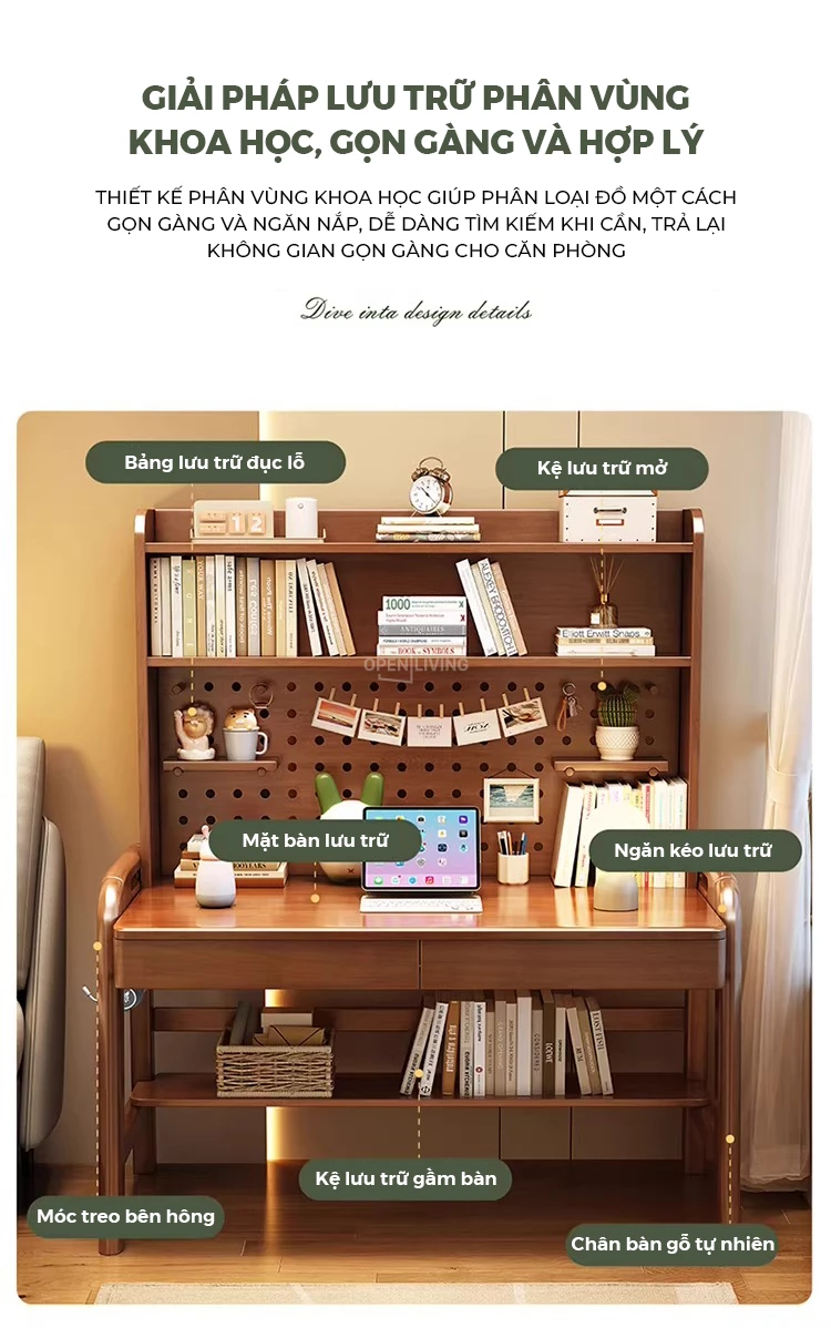 Bàn học gỗ tự nhiên Openliving BTN-482 – Bàn học lưu trữ phân vùng thông minh, kệ đục lỗ đa năng, điều chỉnh chiều cao an toàn cho trẻ