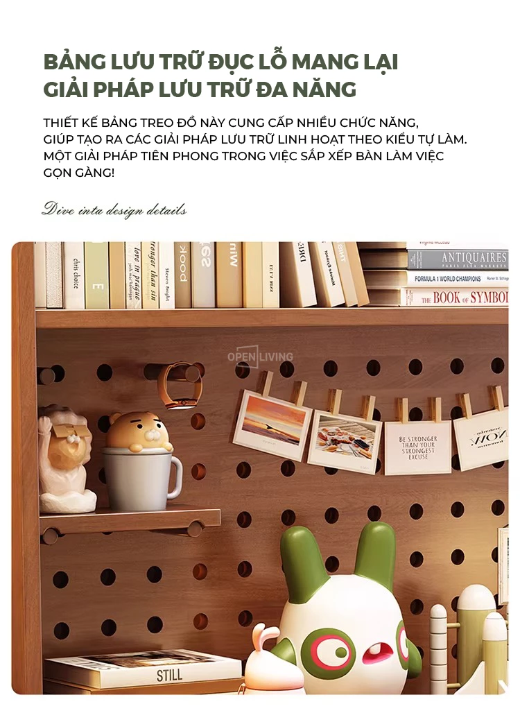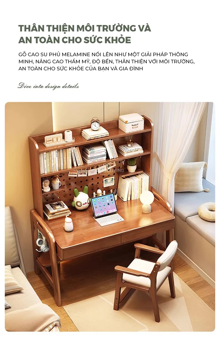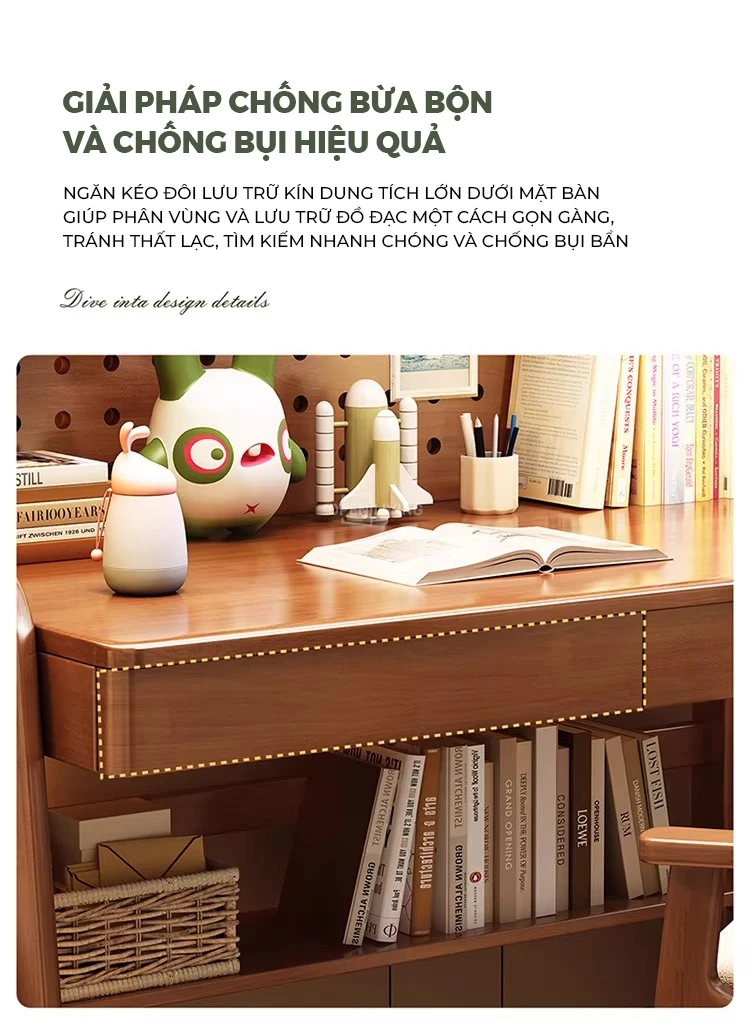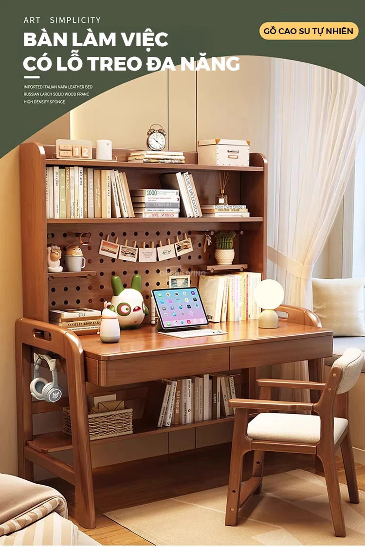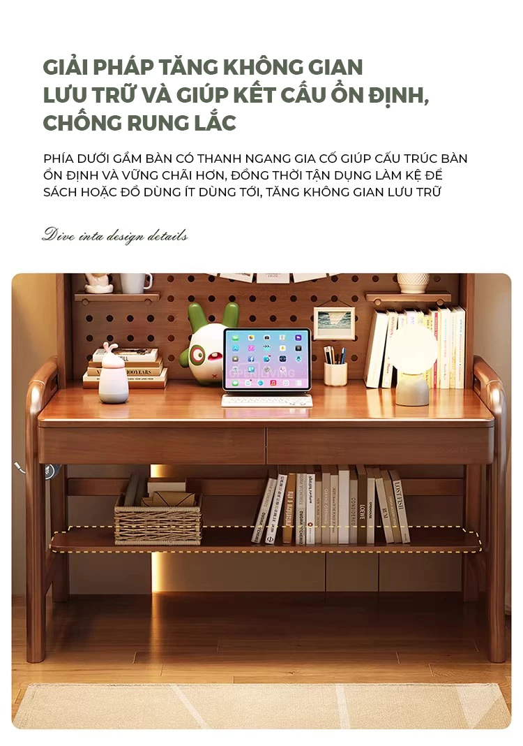 Bàn học gỗ tự nhiên Openliving BTN-482 – Bàn học lưu trữ phân vùng thông minh, kệ đục lỗ đa năng, điều chỉnh chiều cao an toàn cho trẻ