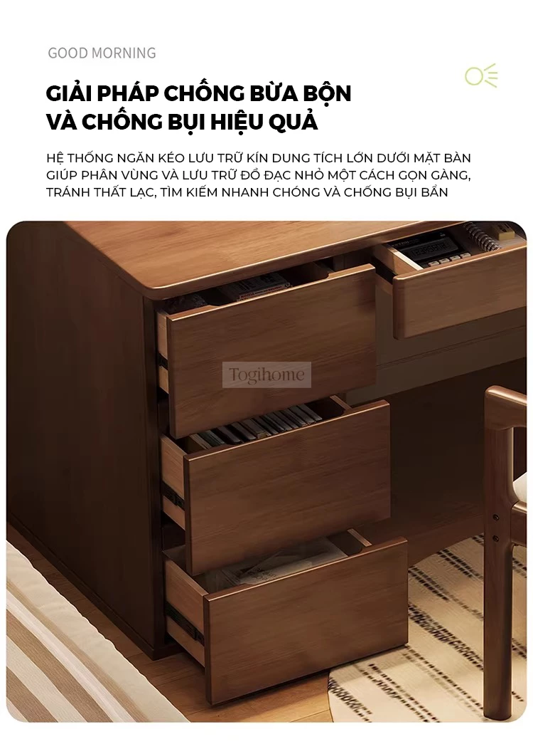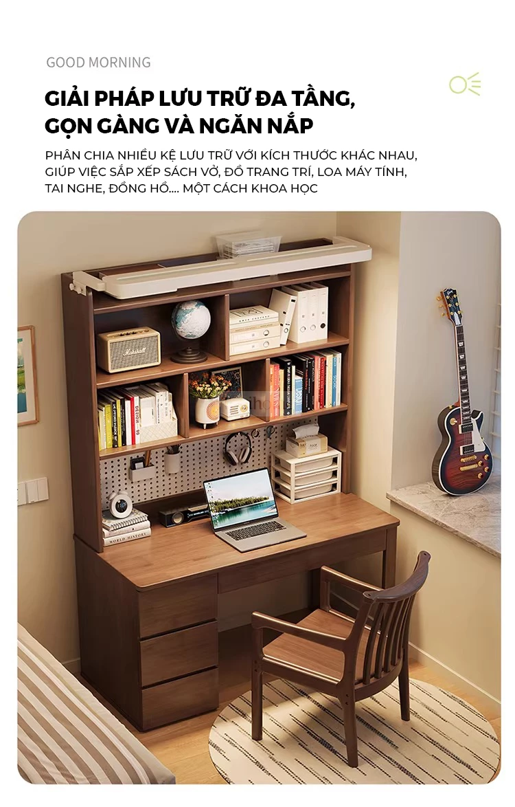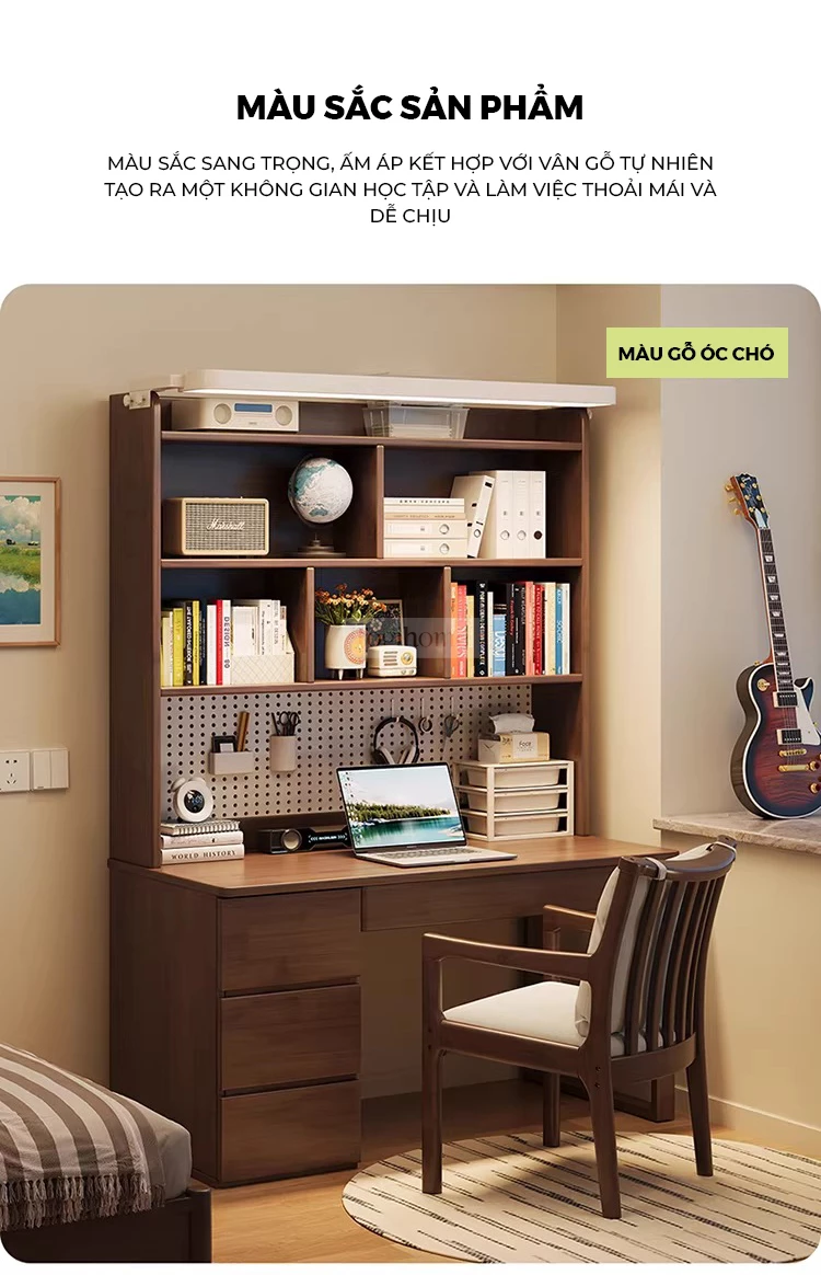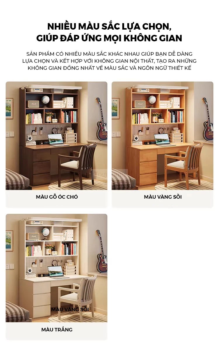 Bàn học gỗ tự nhiên Togismart BTN-486 – Bàn học lưu trữ phân vùng khoa học, kệ sách cao tầng, pegboard treo đồ linh hoạt, ngăn kéo kín chống bừa bộn