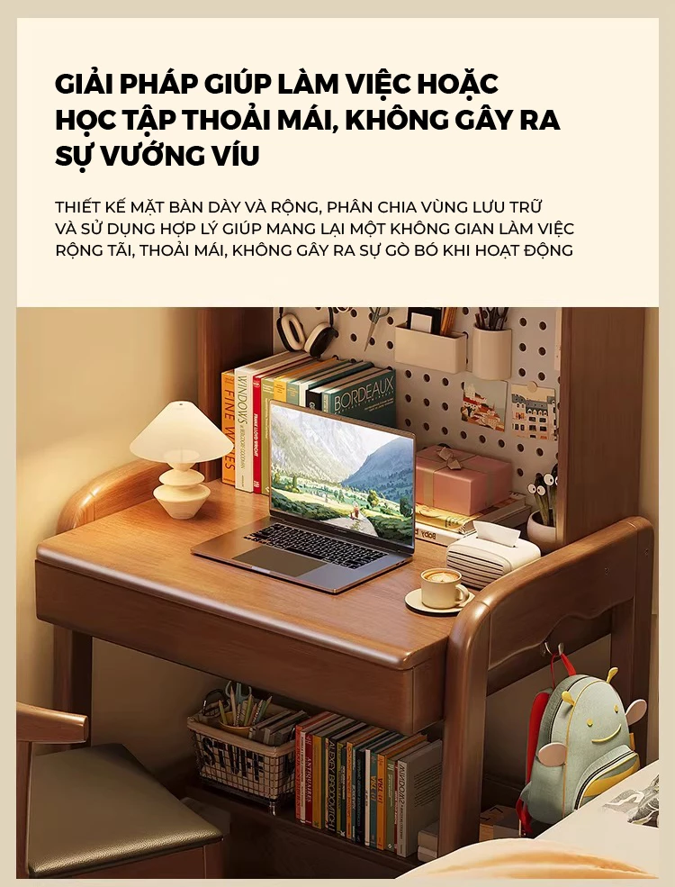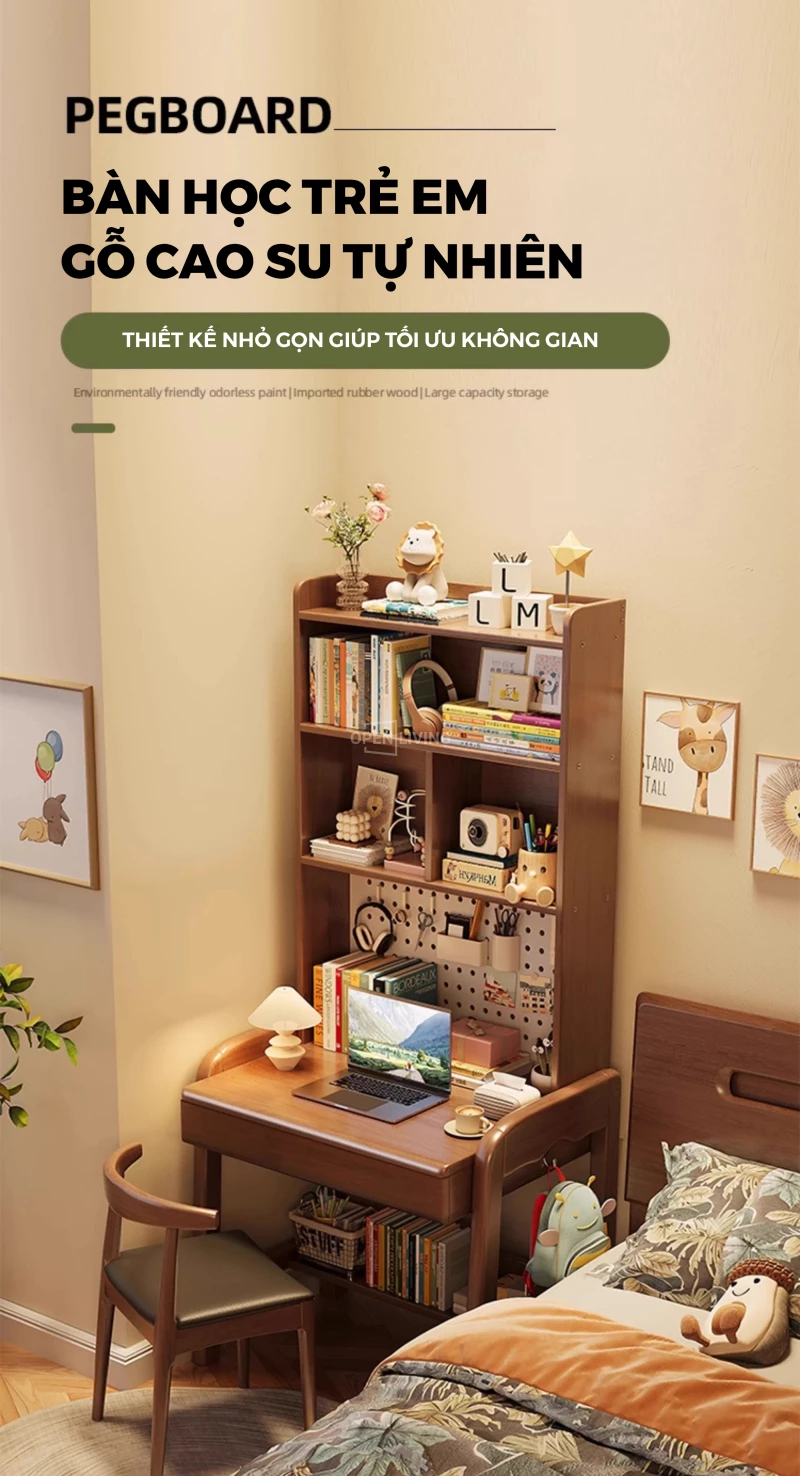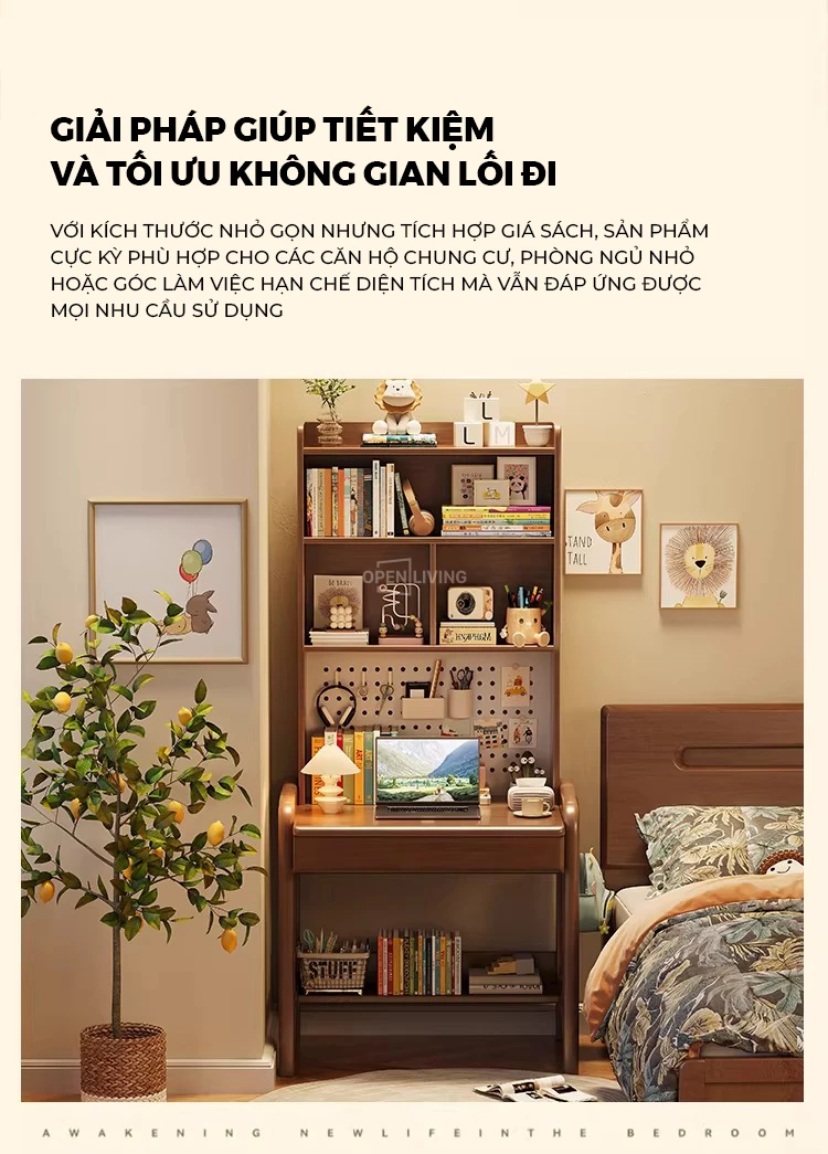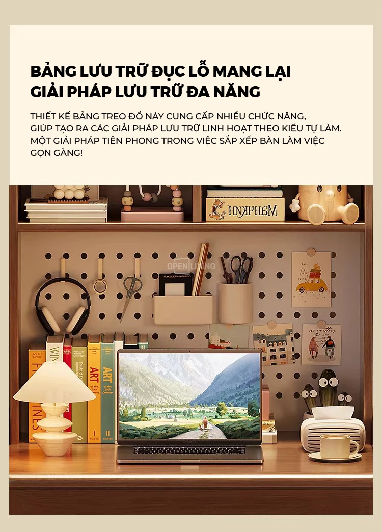 Bàn Làm Việc Gỗ Tự Nhiên Openliving BTN-472 – Thiết Kế Kệ Cao Đục Lỗ Pegboard, Tối Ưu Lưu Trữ Không Gian Nhỏ