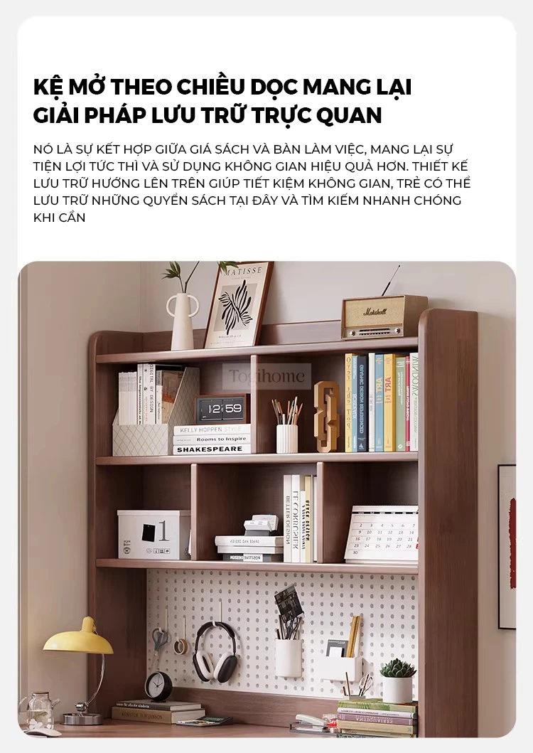 Bàn Làm Việc Góc Chữ L Gỗ Tự Nhiên Togismart BTN742 – Kệ Lưu Trữ Đa Năng, Bảng Treo Pegboard, Bo Cạnh An Toàn