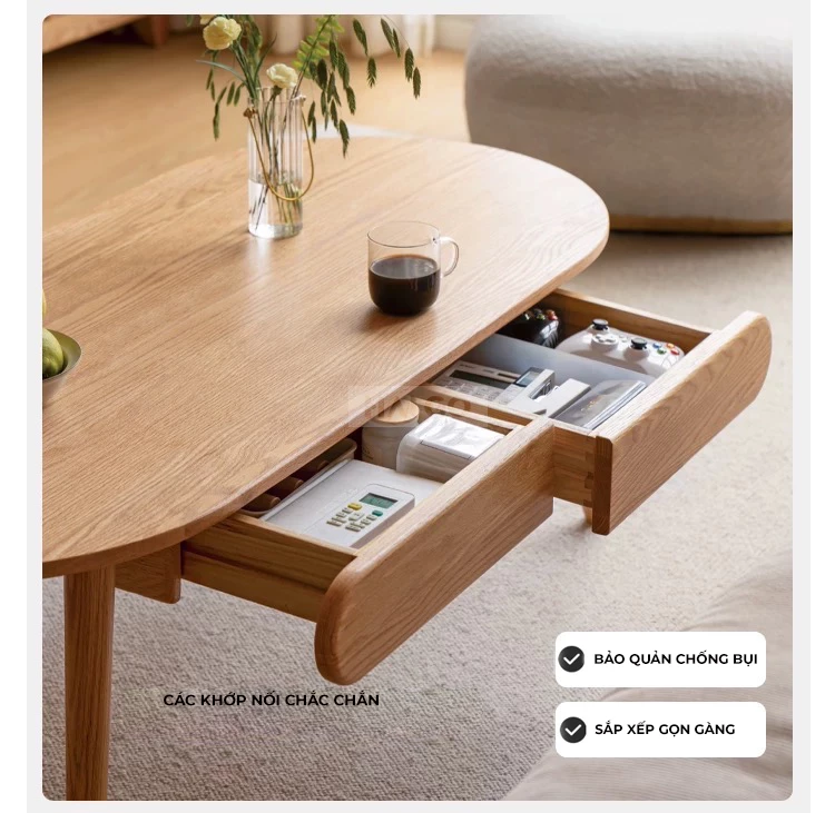 Bàn Trà Gỗ Tự Nhiên Hiện Đại Haigo BT310 sở hữu thiết kế bo góc an toàn, phù hợp gia đình có trẻ nhỏ. Chất liệu gỗ tự nhiên cao cấp, bề mặt nhẵn mịn, chống trầy xước. Bàn tích hợp ngăn kéo ẩn tiện lợi, giúp không gian phòng khách thêm gọn gàng và sang trọng.