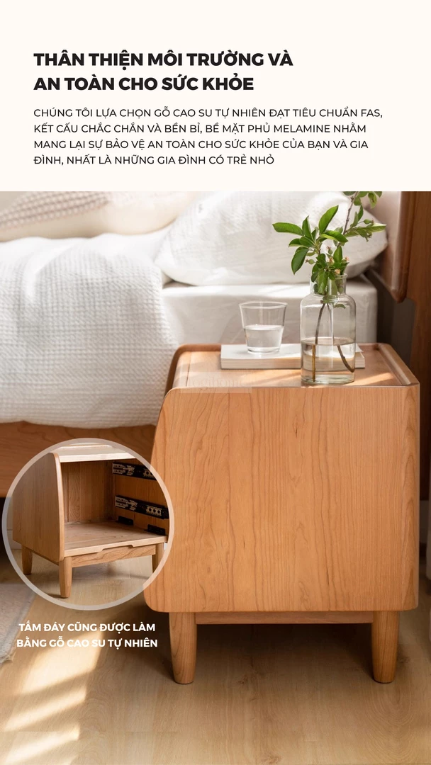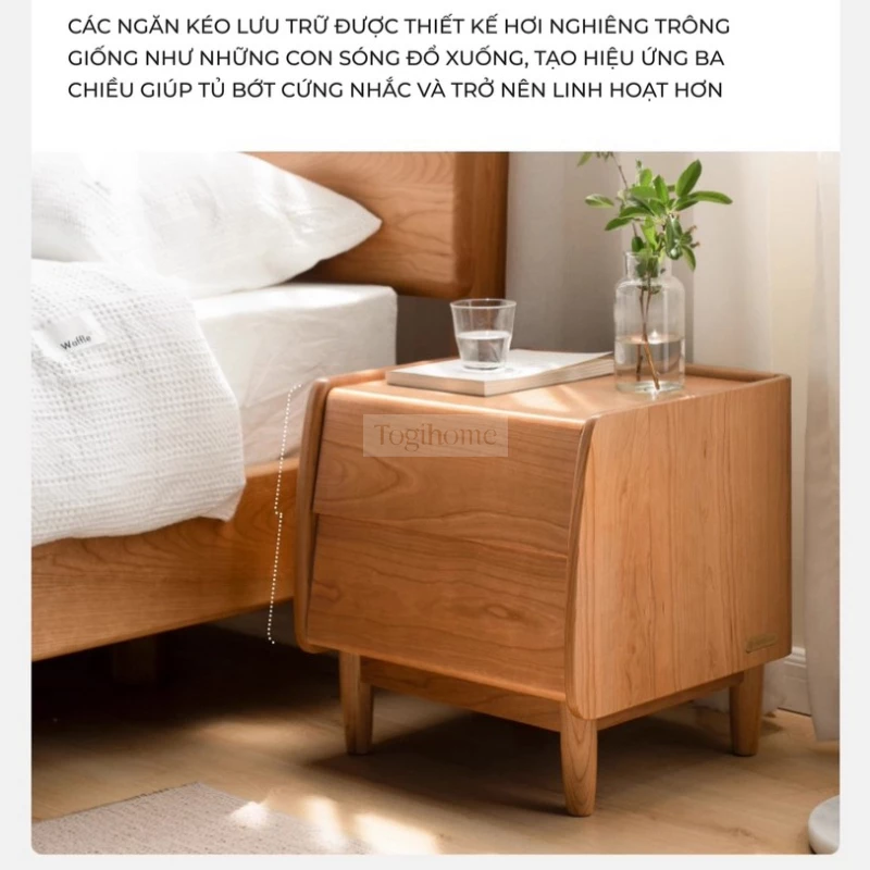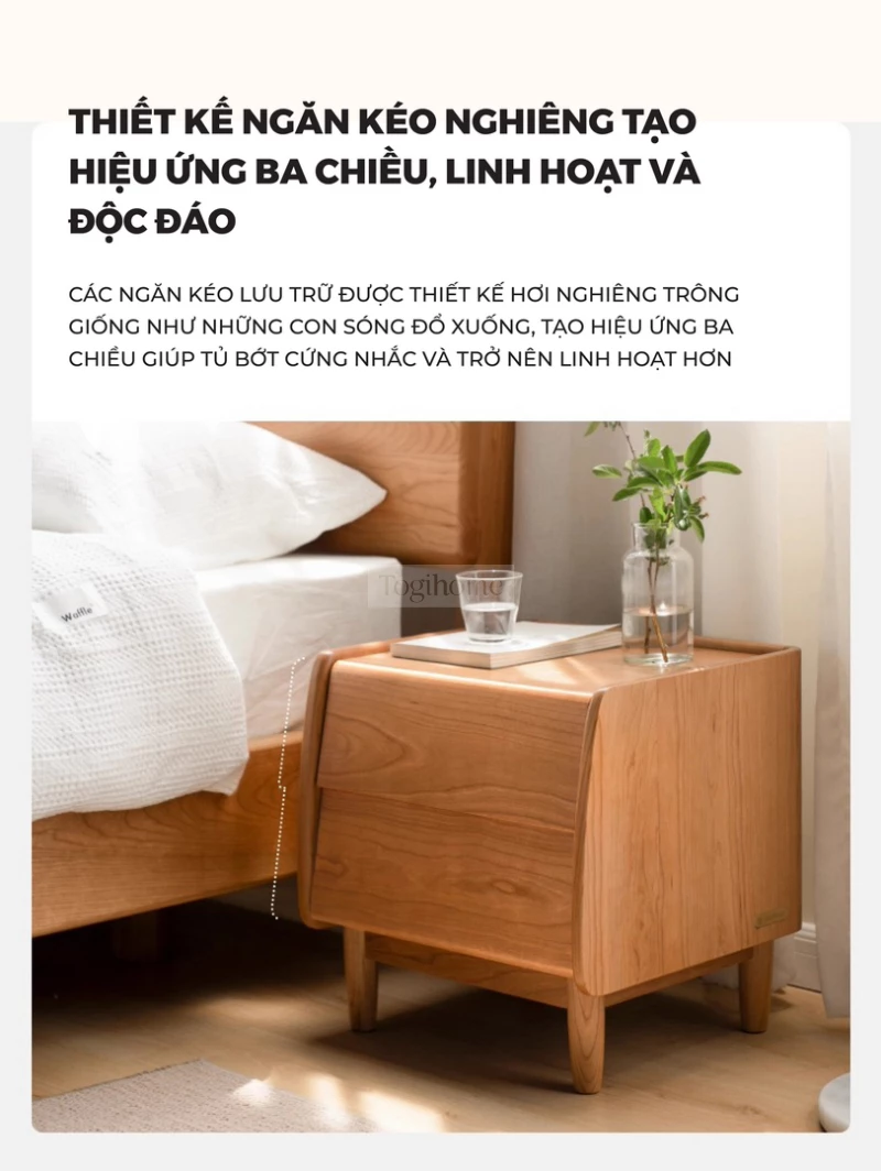 3. Tủ Đầu Giường: Chi tiết nhỏ tinh tế. Mặc dù nhỏ gọn (40cm x 35cm), tủ đầu giường là món đồ đa năng, giúp bạn giữ các vật dụng cá nhân quan trọng trong tầm tay. Thiết kế ngăn kéo tiện dụng của tủ góp phần duy trì không gian ngăn nắp, hoàn thiện vẻ đẹp đồng bộ của cả bộ sưu tập.