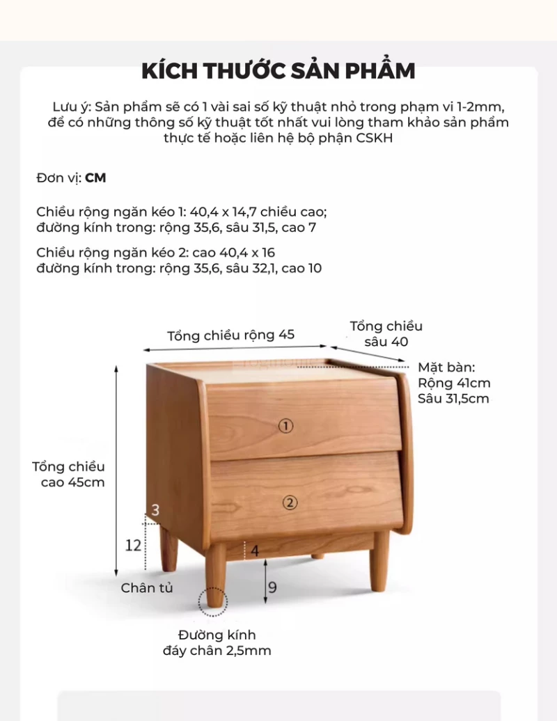 Tủ đầu giường có kích thước cố định 40cm x 35cm, đồng bộ với các sản phẩm khác.