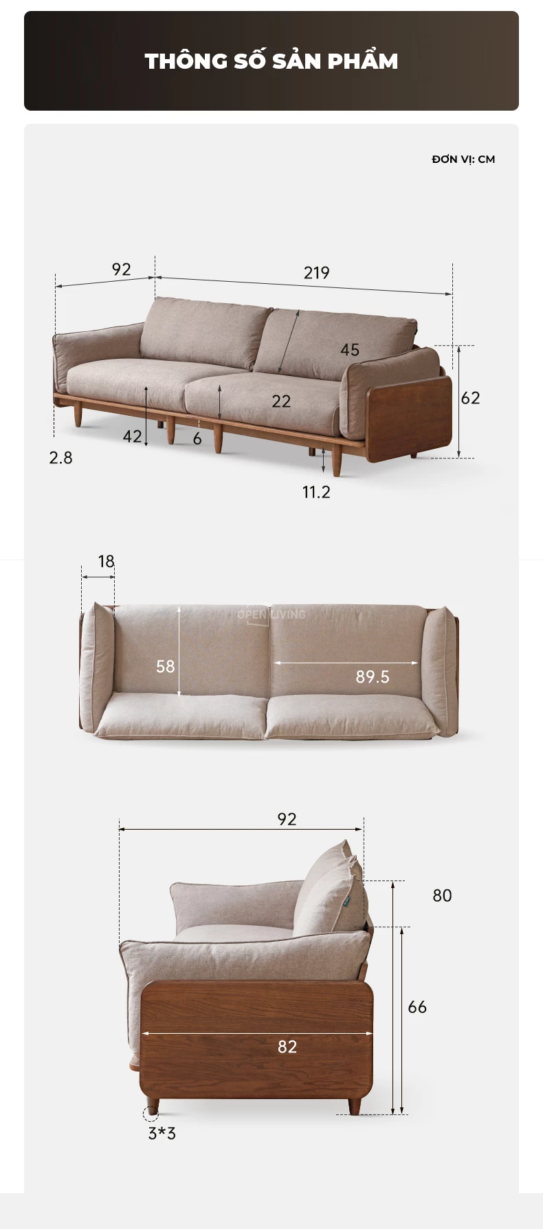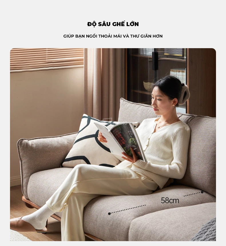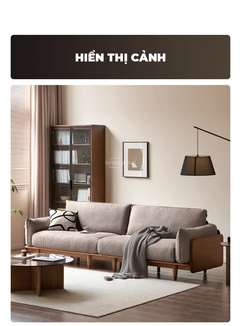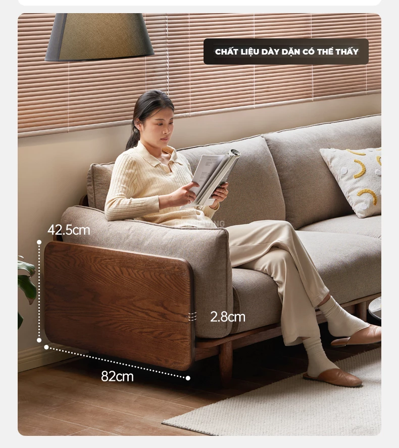 Ghế Sofa Gỗ Tự Nhiên Arca, Tay Vịn Ốp Gỗ Sang Trọng, Vỏ Nệm Tháo Rời - Mã SF118 mang đến trải nghiệm thư giãn đỉnh cao với phần đệm dày đàn hồi, giữ form lâu và êm ái khi tựa lưng hoặc nằm nghỉ. Khung gỗ tự nhiên chắc chắn, phần ốp hông dày 2.8cm tạo cảm giác sang trọng và bền vững. Dáng sofa rộng, sâu, phù hợp cho những buổi đọc sách, xem phim hoặc tiếp khách trong không gian phòng khách hiện đại. Gam màu trung tính dễ phối nội thất, tạo nên không gian ấm áp và tinh tế chuẩn phong cách Contemporary – Japandi.