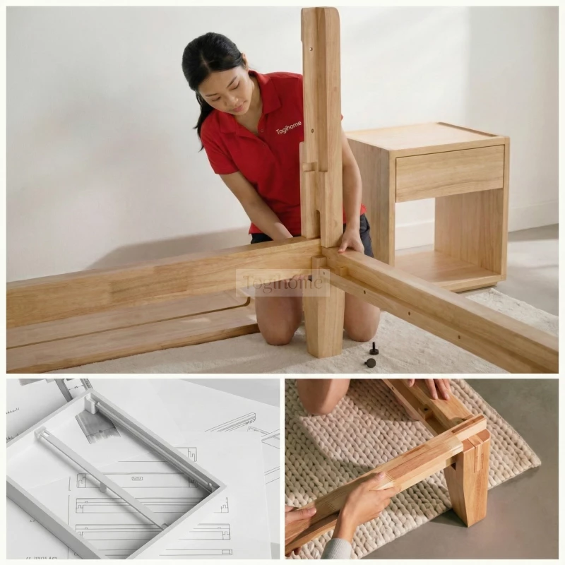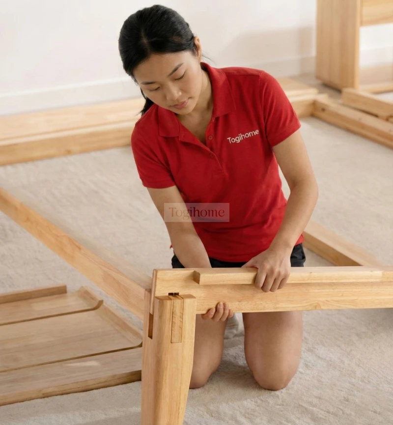 Lắp đặt 0 ốc vít: Các thanh gỗ liên kết với nhau bằng ngàm khóa thông minh. Kết cấu "kiềng 3 chân" giúp giường càng nằm càng chặt, vững chãi trọn đời.