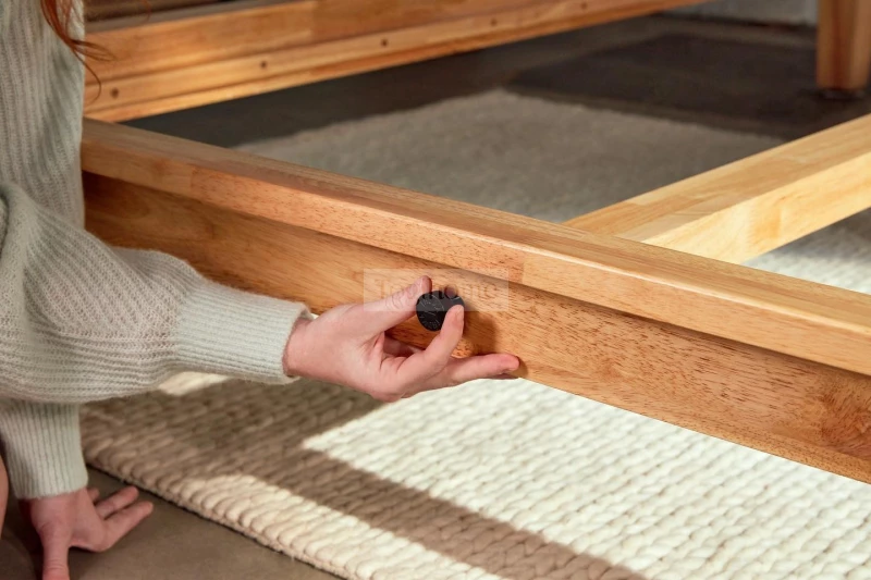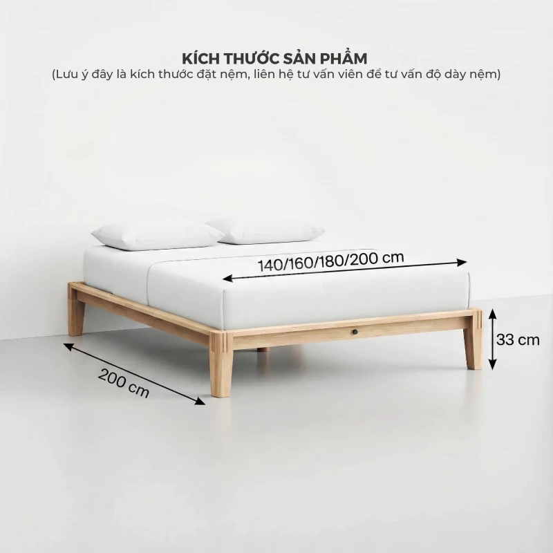 Lắp ghép 0 ốc vít: Các thanh gỗ được cắt gọt chính xác để đan cài vào nhau theo kỹ thuật mộng khóa Nhật Bản. Không cần một con vít kim loại nào, chiếc giường vẫn vững chãi như bàn thạch.