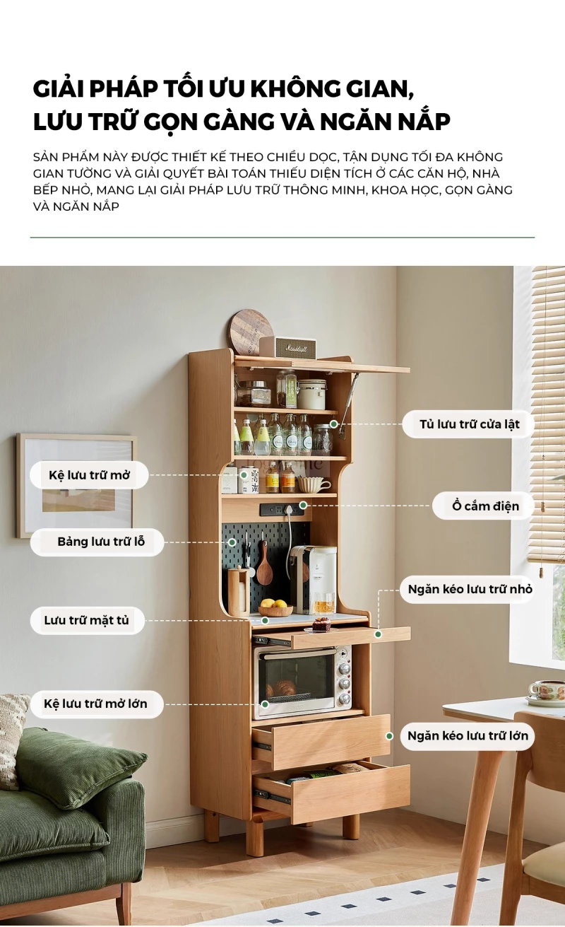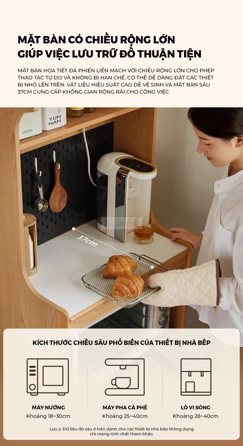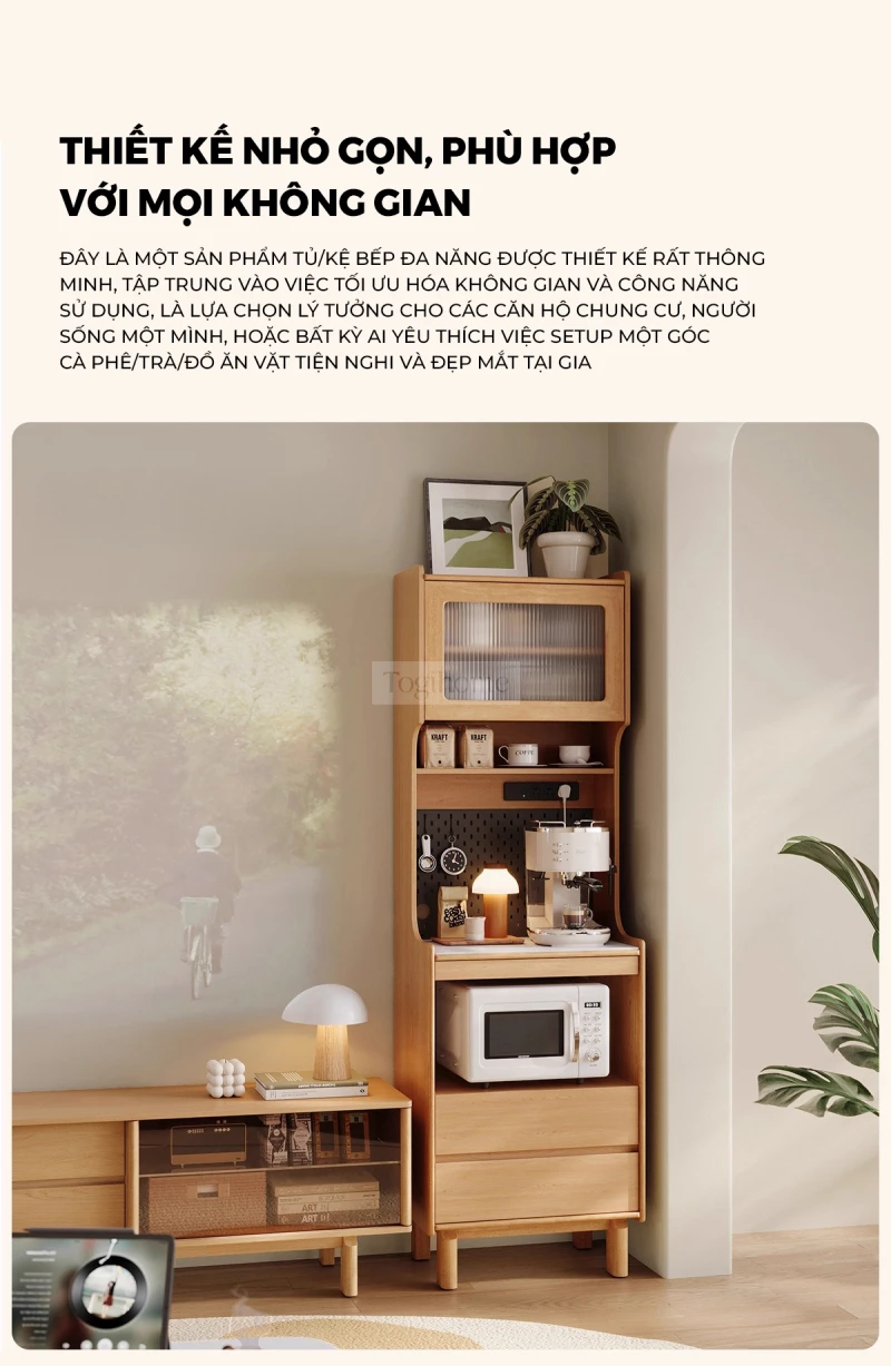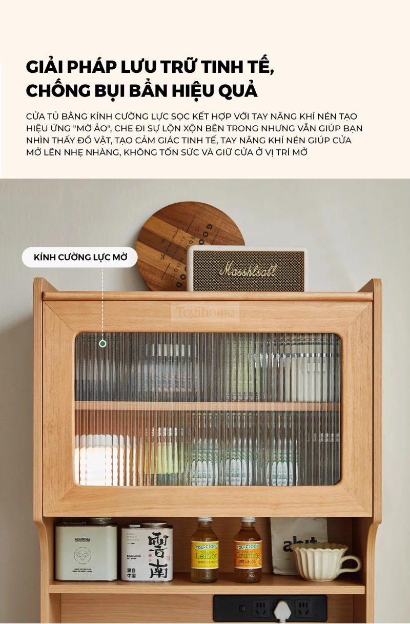 Kệ Để Thiết Bị Bếp Togismart KG111 sử dụng gỗ cao su tự nhiên, bề mặt xử lý mịn, chắc chắn và thân thiện với sức khỏe. Thiết kế dáng đứng tối ưu diện tích, phân tầng khoa học để đặt lò vi sóng, máy pha cà phê và đồ dùng bếp gọn gàng. Cửa kính cường lực mờ giúp chống bụi, dễ quan sát. Thanh nâng khí nén chất lượng cao hỗ trợ đóng mở nhẹ nhàng, an toàn. Ngăn kéo sâu nhiều lớp giúp phân loại đồ dùng, tránh thất lạc.