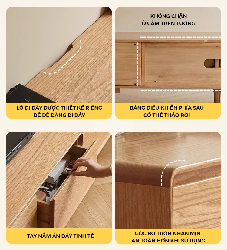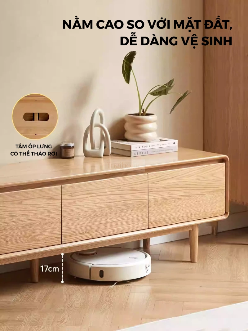 Kệ Tivi Gỗ Tự Nhiên Phong Cách Hiện Đại Togismart KTV 114 thiết kế phong cách hiện đại, sử dụng gỗ tự nhiên cao cấp, bền đẹp và thân thiện môi trường. Kiểu dáng tối giản, bo góc an toàn, phù hợp nhiều không gian sống. Tích hợp ngăn chứa tiện lợi, giúp không gian phòng khách thêm gọn gàng và sang trọng.