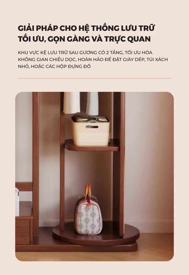 Kệ Treo Đồ Kết Hợp Gương Soi Toàn Thân CV711 là giải pháp nội thất hai trong một lý tưởng, giúp giải quyết vấn đề lưu trữ và làm đẹp trong các không gian sống hiện đại, đặc biệt là căn hộ nhỏ. Sản phẩm này tích hợp một cách thông minh gương soi toàn thân lớn, giúp bạn dễ dàng kiểm tra trang phục từ đầu đến chân, cùng với hệ thống móc treo và kệ tiện lợi để sắp xếp áo khoác, túi xách, mũ nón hoặc các phụ kiện hàng ngày. CV711 không chỉ mang lại sự gọn gàng, ngăn nắp cho khu vực cửa ra vào hay phòng ngủ mà còn tạo cảm giác không gian rộng rãi và có chiều sâu hơn nhờ hiệu ứng từ gương soi. Đây là một món đồ nội thất thiết thực, đầy phong cách và tối ưu hóa diện tích hiệu quả.
