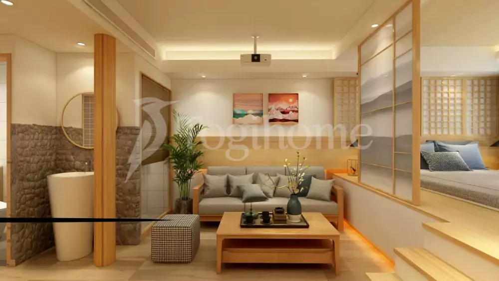 Nội thất nhà phố 37m2 phong cách Nhật bản kết hợp phòng khách và phòng ngủ với gam màu trầm ấm