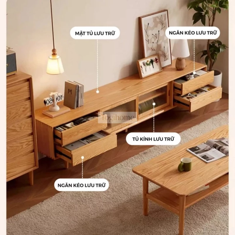 2. Kệ Tivi: Giải pháp lưu trữ và trưng bày thông minh. Với các tùy chọn kích thước linh hoạt (1m2, 1m6, 1m8), kệ Tivi Cocoa Living không chỉ là nơi đặt thiết bị giải trí mà còn cung cấp không gian lưu trữ rộng rãi cho sách, đồ trang trí, giúp phòng khách luôn gọn gàng và thẩm mỹ.