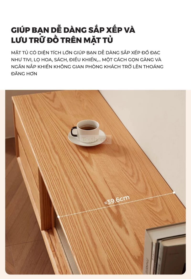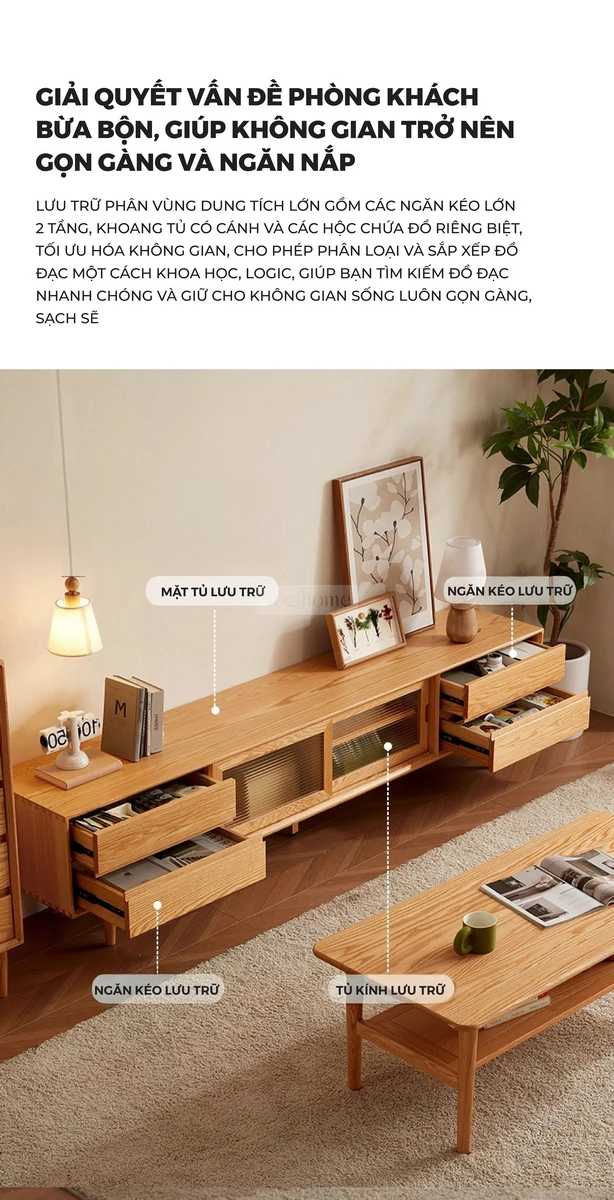 2. Kệ Tivi: Giải pháp lưu trữ và trưng bày thông minh. Với các tùy chọn kích thước linh hoạt (1m2, 1m6, 1m8), kệ Tivi Cocoa Living không chỉ là nơi đặt thiết bị giải trí mà còn cung cấp không gian lưu trữ rộng rãi cho sách, đồ trang trí, giúp phòng khách luôn gọn gàng và thẩm mỹ.