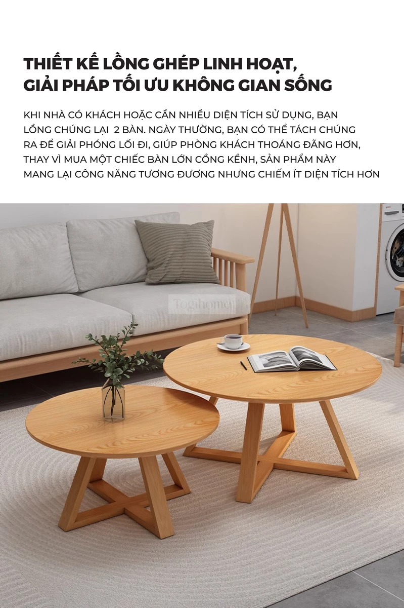 3. Bàn Trà: Chi tiết hoàn thiện vẻ đẹp. Với các tùy chọn Bàn Trà D45cm (nhỏ), D60cm (lớn) hoặc Combo D60/D45 đa năng, sản phẩm này tạo điểm nhấn ấm áp và tinh tế cho khu vực trung tâm. Thiết kế mặt tròn và kết cấu vững chãi, phục vụ hoàn hảo cho nhu cầu tiếp khách và sinh hoạt hằng ngày.