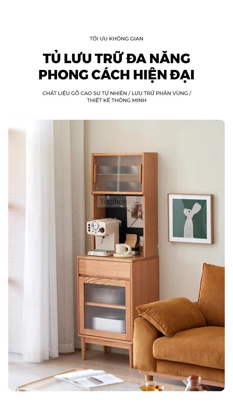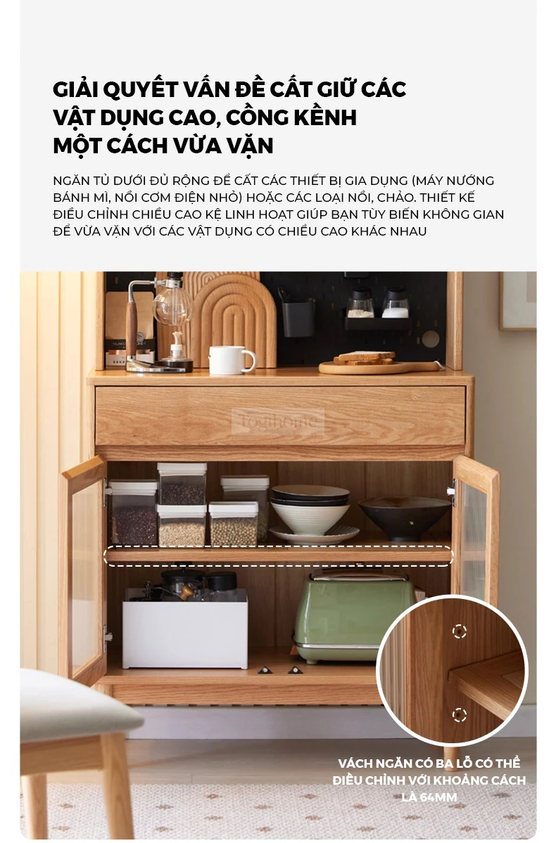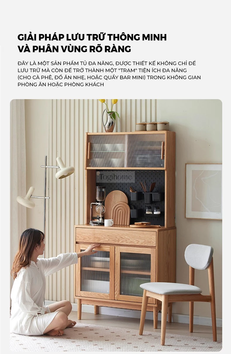 Tủ Bếp Khô Togismart Tone Màu Sáng Thiết Kế Tối Ưu Không Gian Lưu Trữ Tiện Lợi – Mã KG127 là giải pháp lưu trữ tinh gọn cho căn hộ hiện đại, không gian bếp khô hoặc khu vực pha chế – pantry. Thiết kế tủ đứng chia tầng khoa học, kết hợp khoang tủ kính, ngăn kéo và kệ mở giúp tận dụng tối đa chiều cao, sắp xếp gọn gàng bát đĩa, đồ khô, thiết bị nhỏ và vật dụng hằng ngày. Tone màu gỗ sáng mang lại cảm giác ấm áp, nhẹ nhàng, dễ phối với nhiều phong cách nội thất.