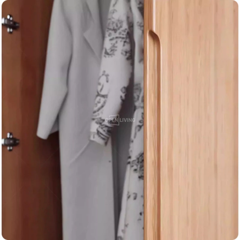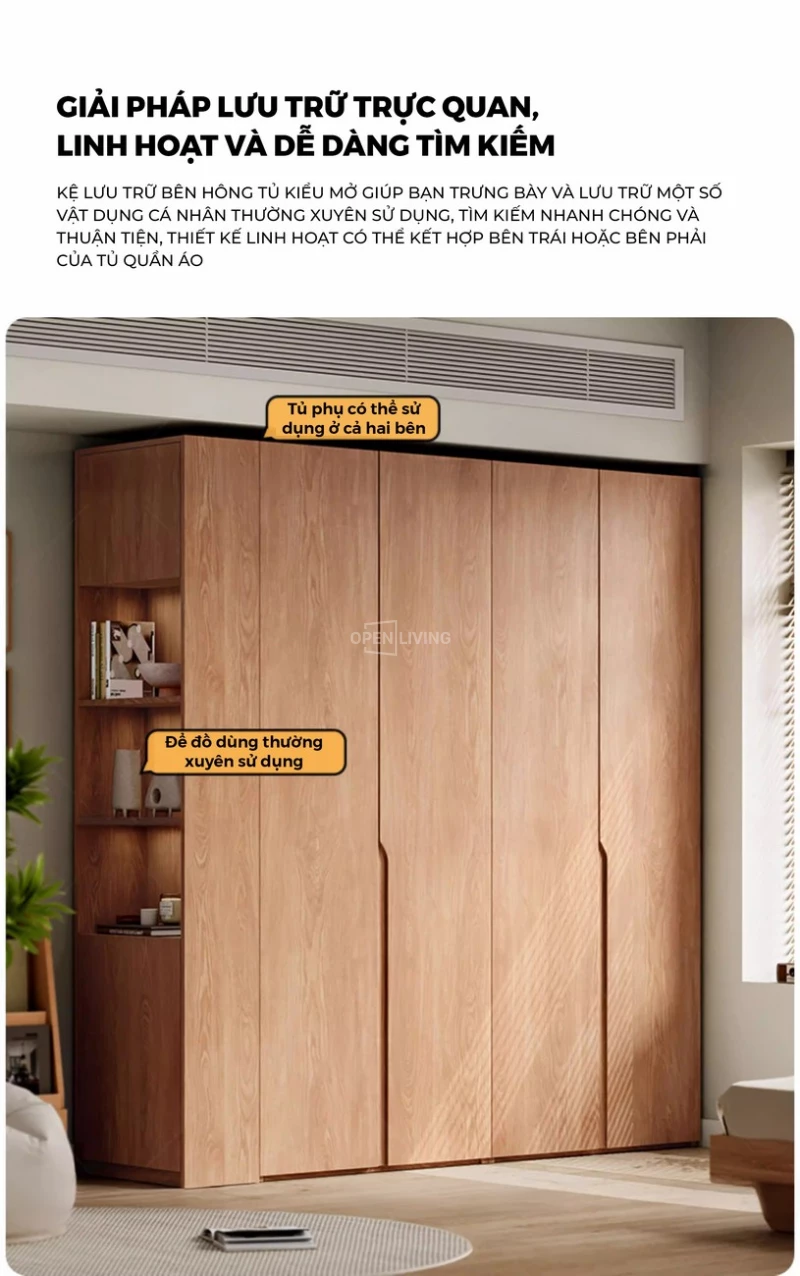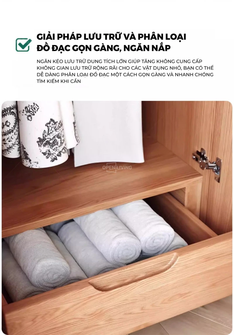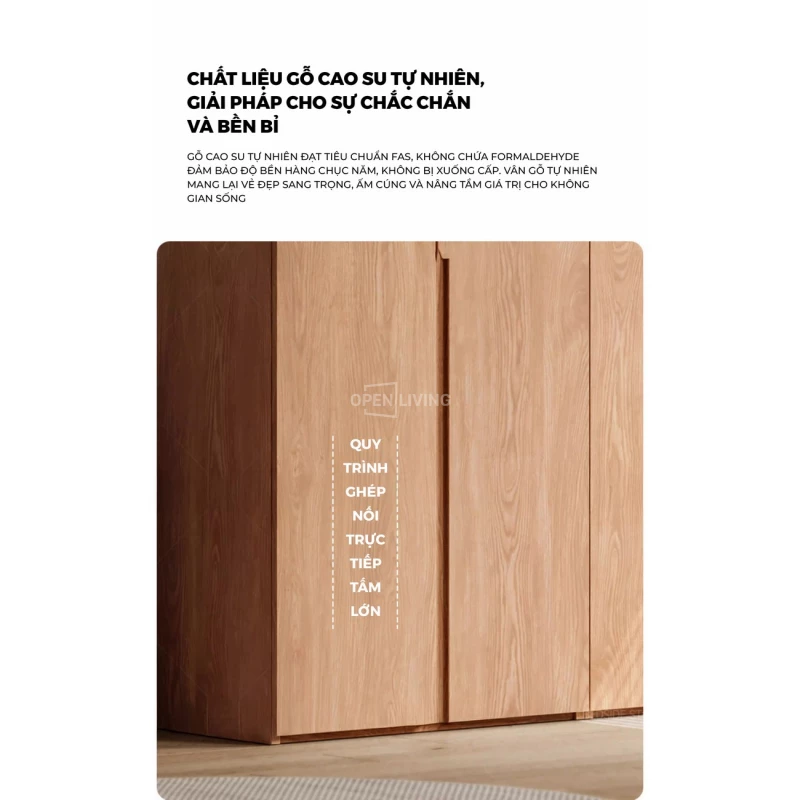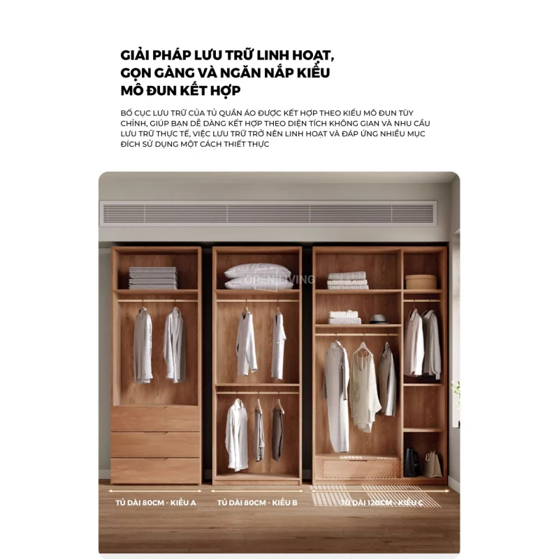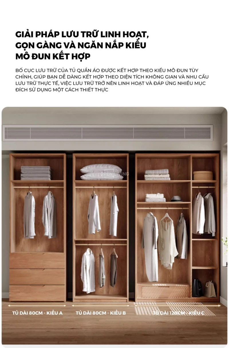 Tủ Quần Áo Gỗ Cao Su Tự Nhiên Openliving TQ680 – Tủ Module 3–5 Cánh Phong Cách Bắc Âu, Phân Khu Treo Dài Ngắn Khoa Học