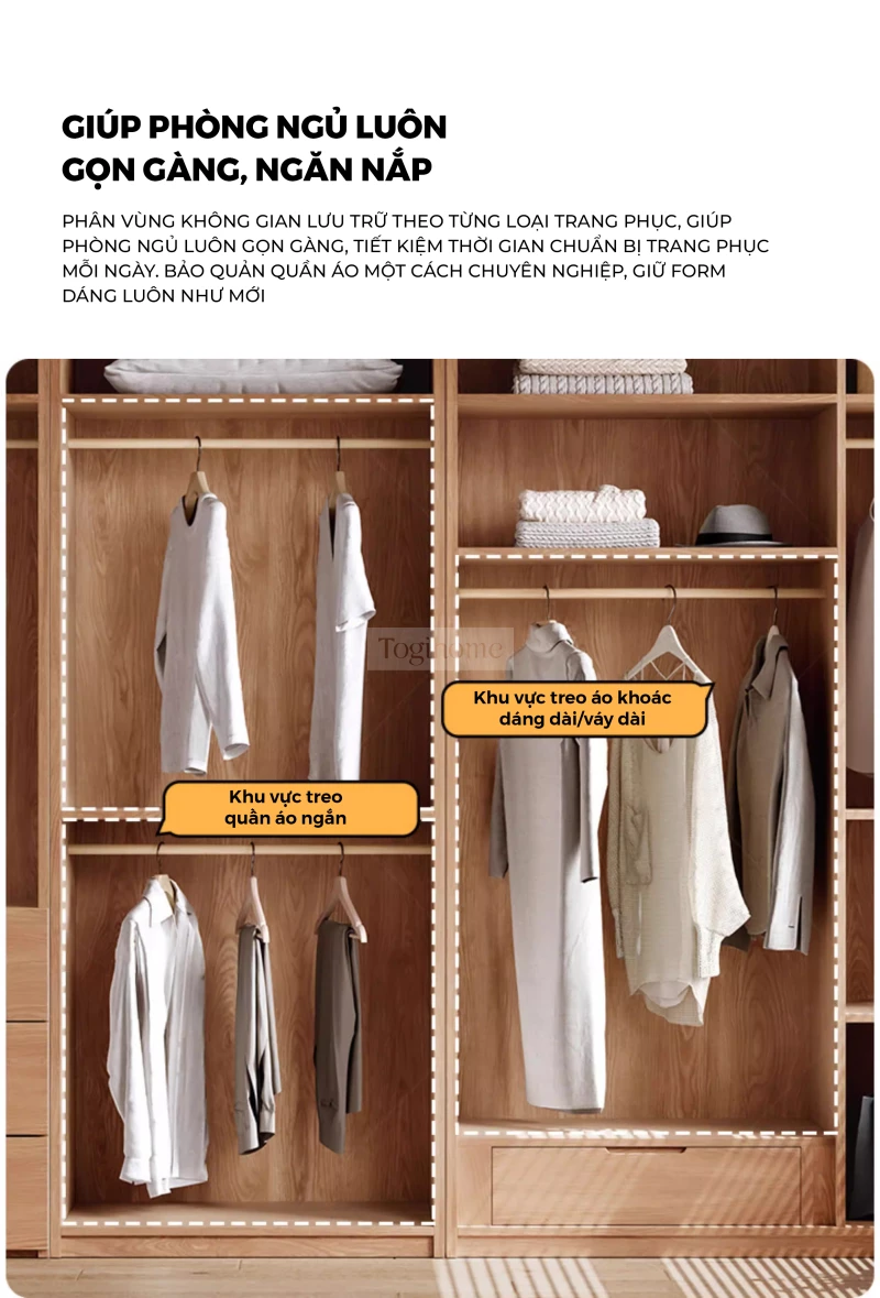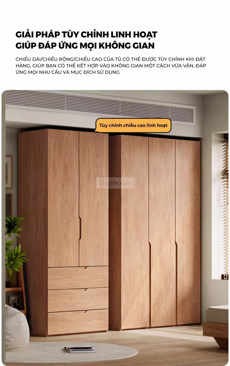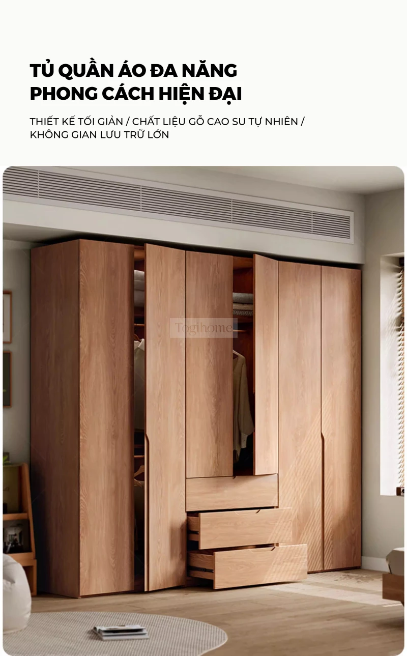 Tủ Quần Áo Gỗ Cao Su Tự Nhiên Togihome TQ680 – Tủ Module 3–5 Cánh Phong Cách Bắc Âu, Phân Khu Treo Dài Ngắn Khoa Học