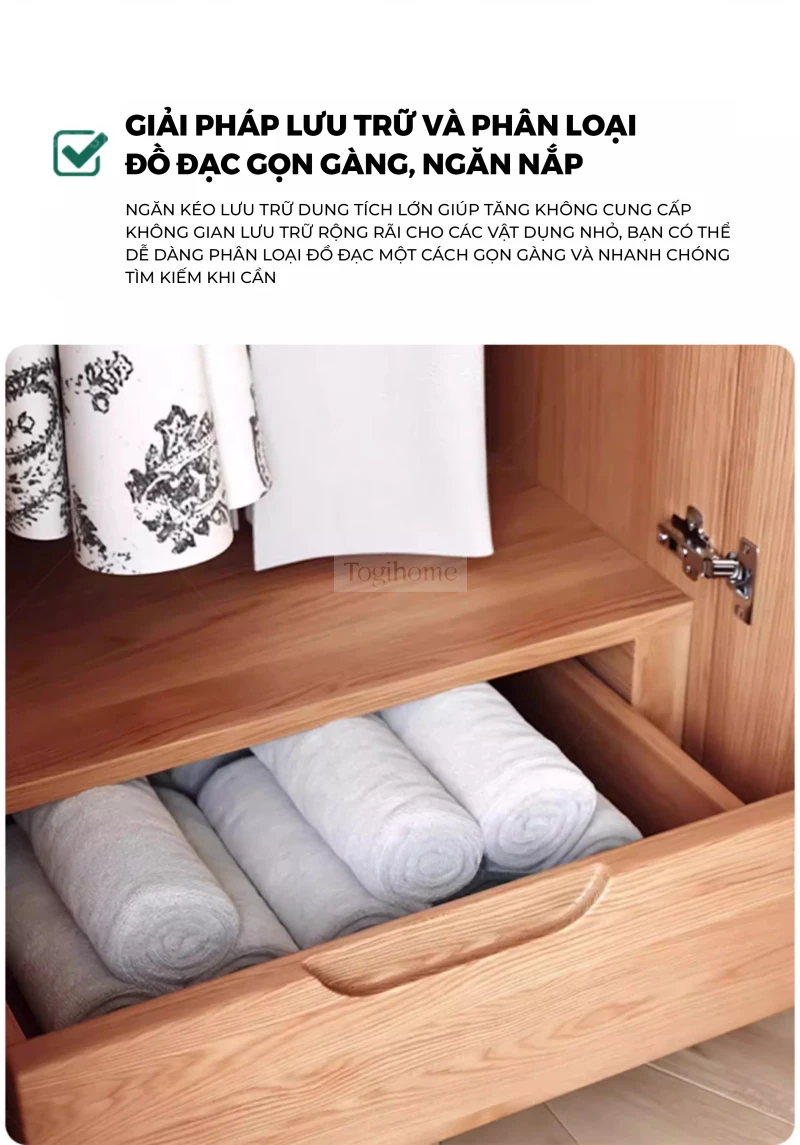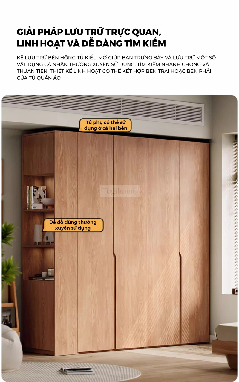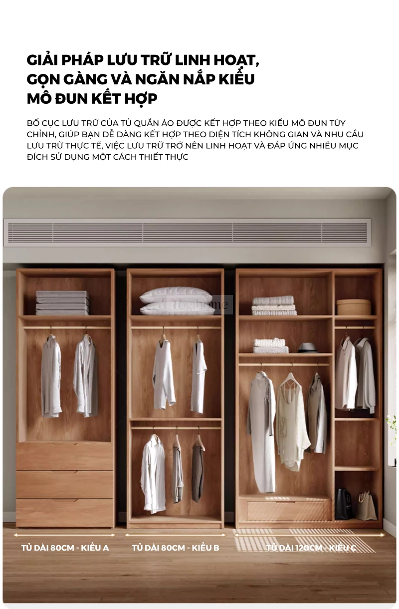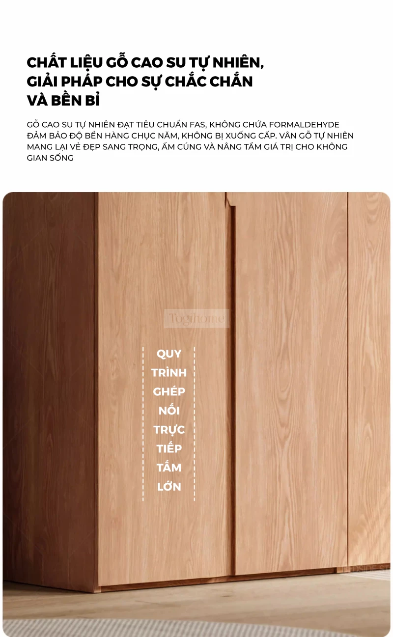 Tủ Quần Áo Gỗ Cao Su Tự Nhiên Togihome TQ680 – Tủ Module 3–5 Cánh Phong Cách Bắc Âu, Phân Khu Treo Dài Ngắn Khoa Học