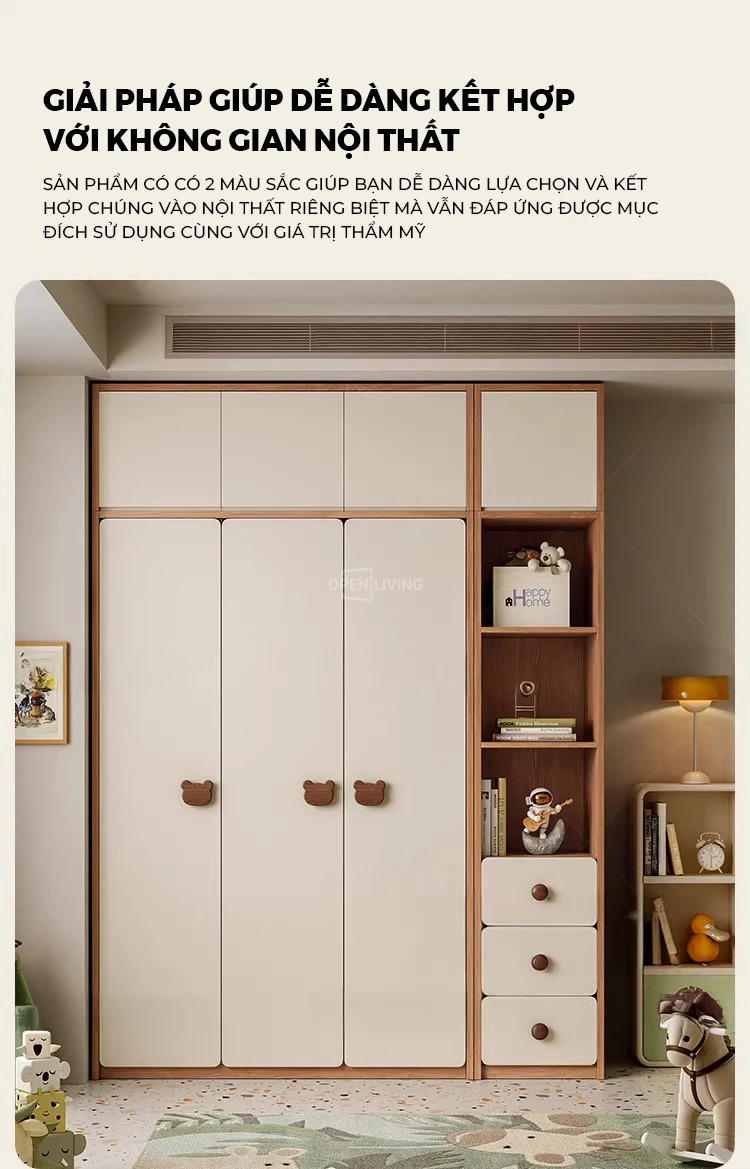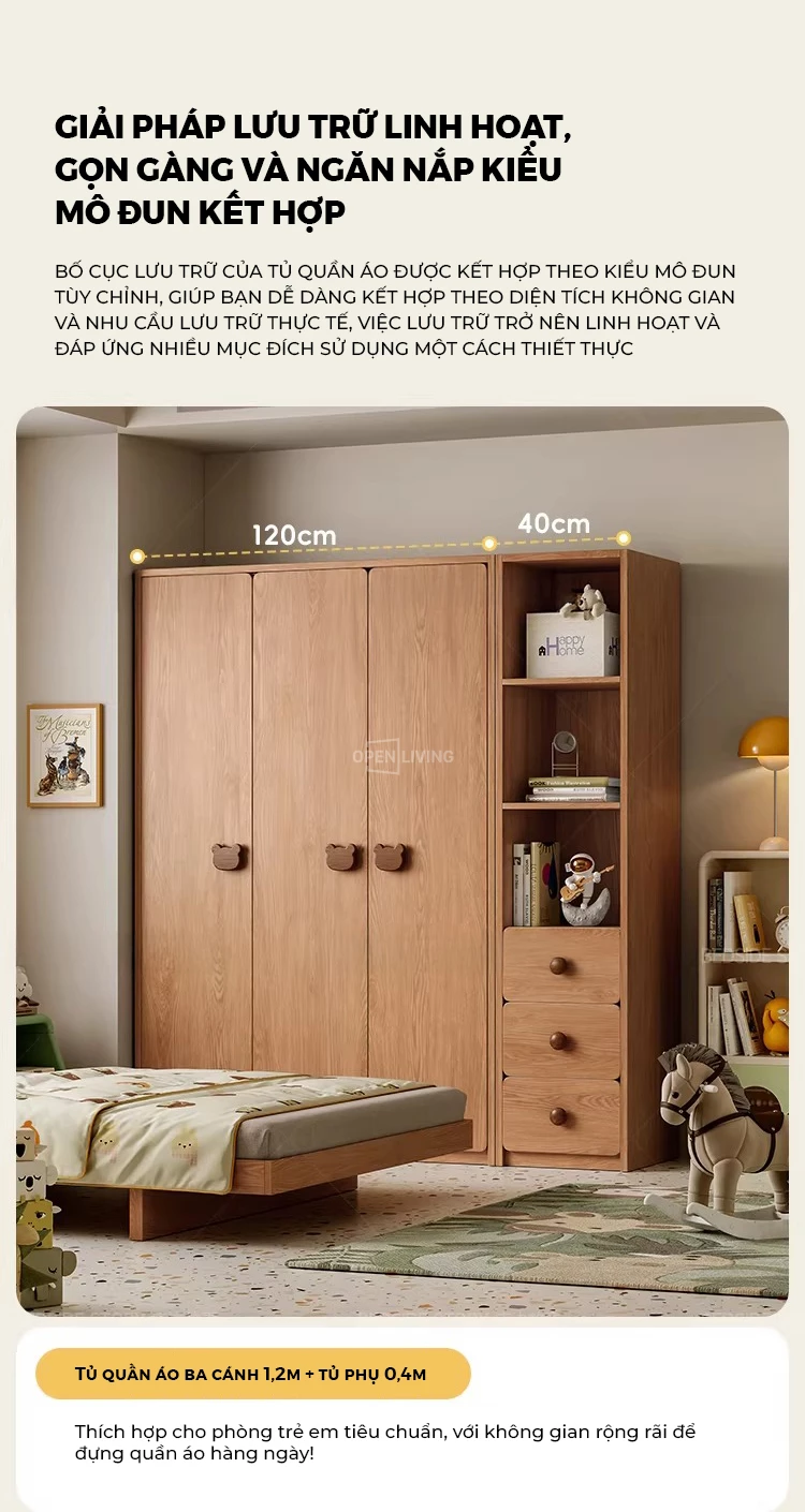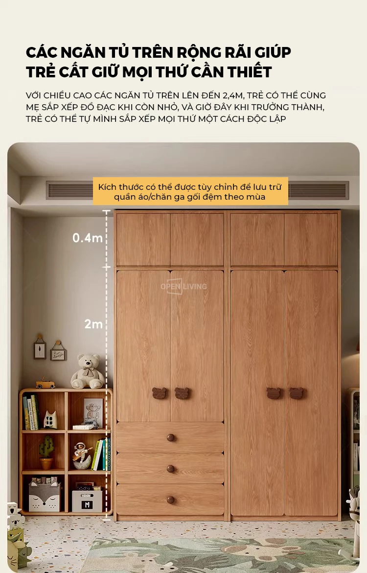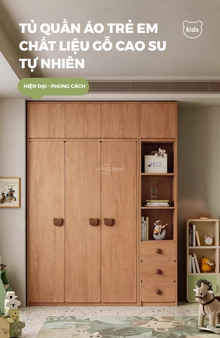 Tủ Quần Áo Trẻ Em 4 Cánh Gỗ Cao Su Tự Nhiên OTA 027 – Tủ Áo Bé Trai Bé Gái 3 Ngăn Kéo, Thiết Kế An Toàn Bo Tròn