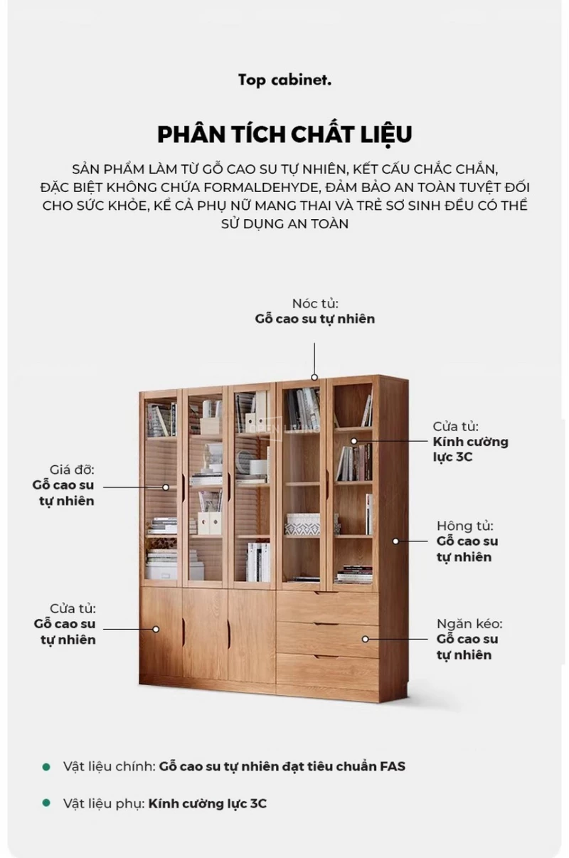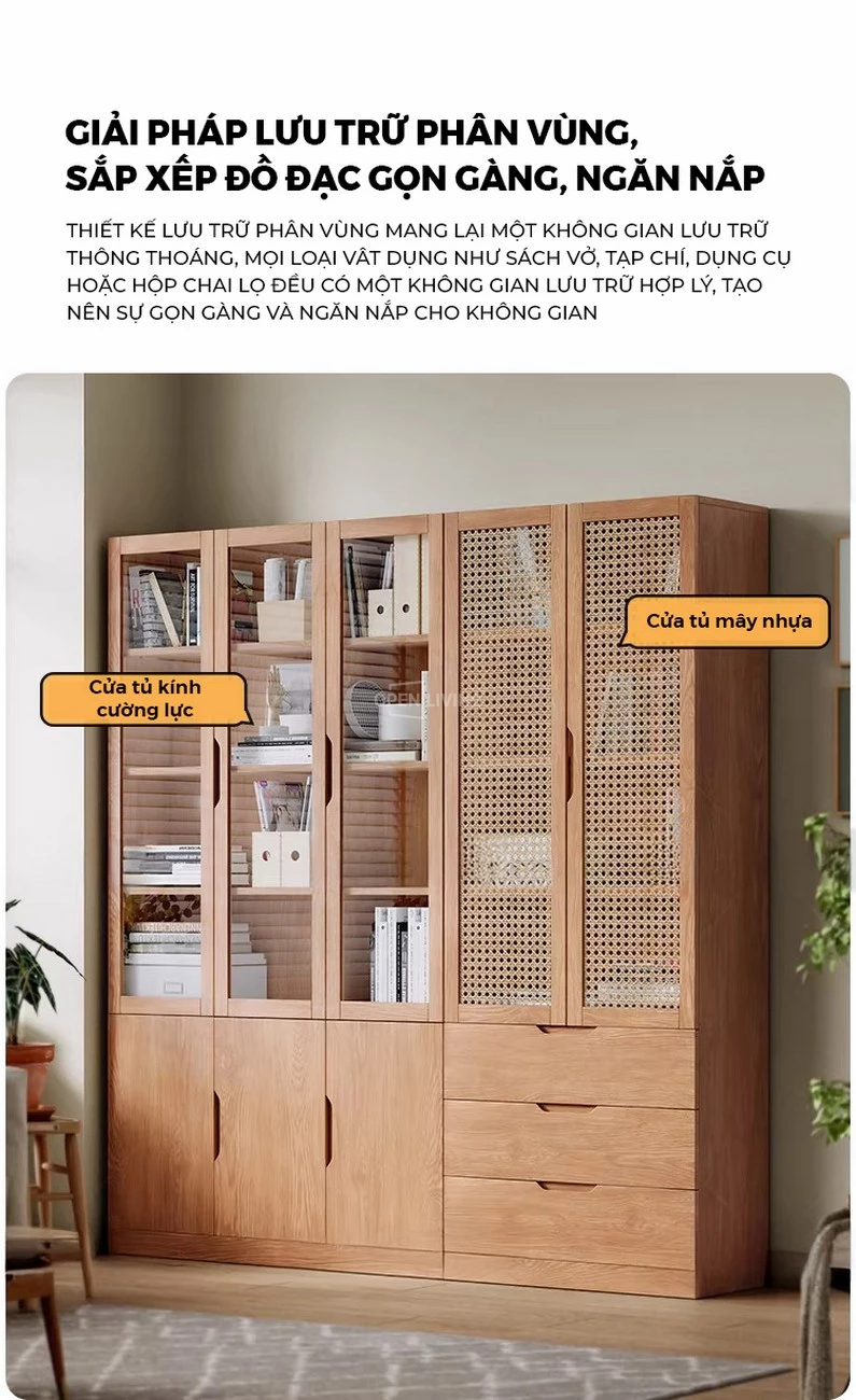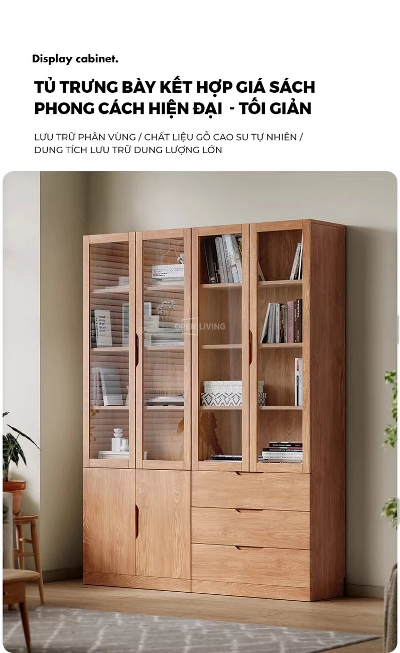 Tủ Sách Kính Kết Hợp Ngăn Kéo Gỗ Tự Nhiên Openliving TS480 – Lưu Trữ Hồ Sơ, Sách, Tài Liệu Gọn Gàng