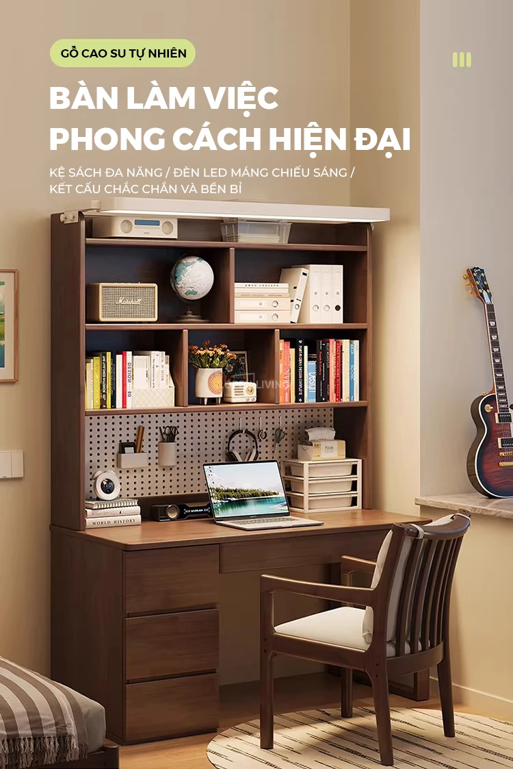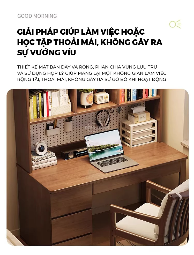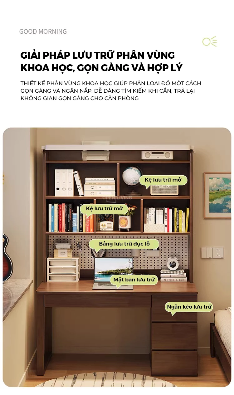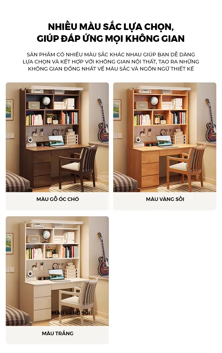 Bàn học gỗ tự nhiên Openliving BTN-486 – Bàn học lưu trữ phân vùng khoa học, kệ sách cao tầng, pegboard treo đồ linh hoạt, ngăn kéo kín chống bừa bộn