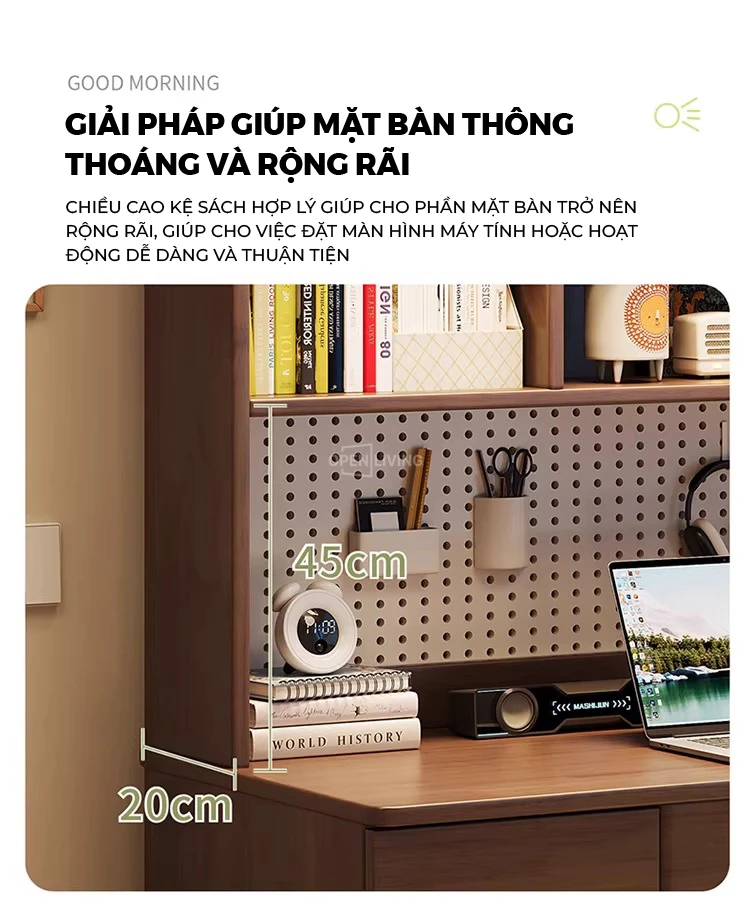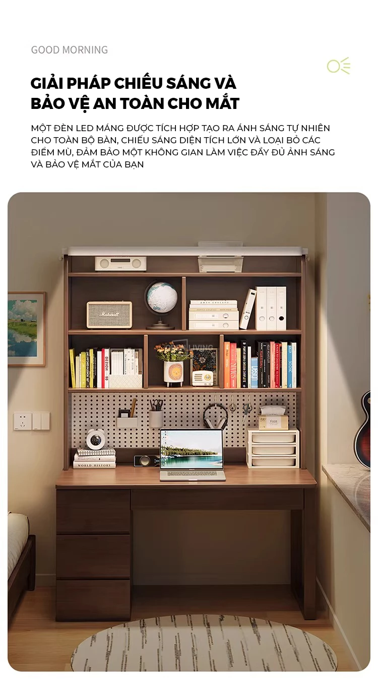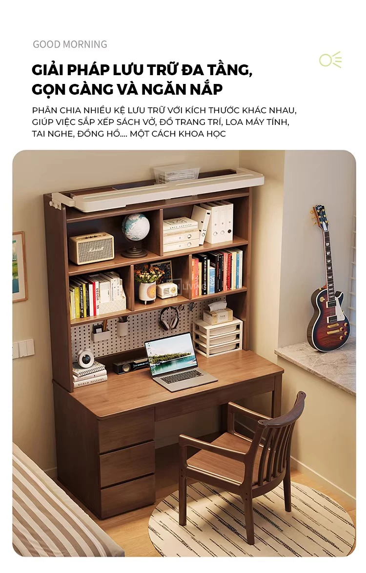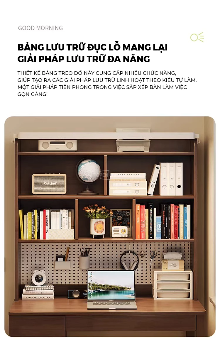 Bàn học gỗ tự nhiên Openliving BTN-486 – Bàn học lưu trữ phân vùng khoa học, kệ sách cao tầng, pegboard treo đồ linh hoạt, ngăn kéo kín chống bừa bộn