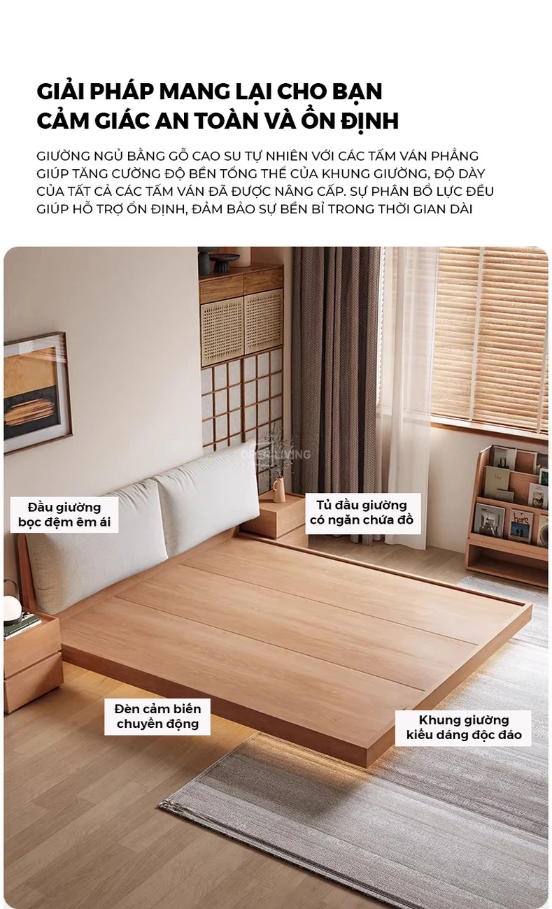 Giường gỗ cao su tự nhiên Togihome GNH290 gây ấn tượng mạnh mẽ bởi thiết kế liền khối thanh lịch, mang lại cảm giác vững chãi và sự sang trọng tinh tế cho phòng ngủ. Sản phẩm được chế tác từ gỗ cao su tự nhiên tuyển chọn, trải qua quy trình xử lý hiện đại giúp chống mối mọt, cong vênh và đảm bảo độ bền vượt trội theo thời gian. Với những đường nét tối giản nhưng sắc sảo, GNH290 dễ dàng hòa hợp với nhiều phong cách nội thất từ hiện đại đến Bắc Âu. Bề mặt gỗ được gia công mịn màng, giữ trọn vẹn màu sắc tự nhiên và vân gỗ ấm áp, tạo nên một nơi nghỉ ngơi thư thái và an lành. Đây là sự lựa chọn hoàn hảo cho những ai tìm kiếm một chiếc giường ngủ không chỉ bền bỉ mà còn sở hữu vẻ đẹp nghệ thuật không lỗi mốt. Đặc biệt, để tăng thêm phần tiện nghi và lung linh cho không gian, bạn có thể lựa chọn tích hợp thêm hệ thống đèn LED hiện đại chỉ với mức giá 600.000đ.