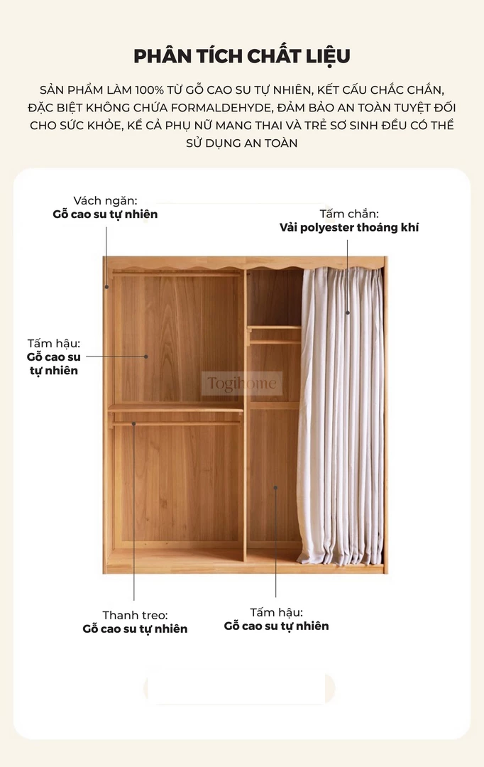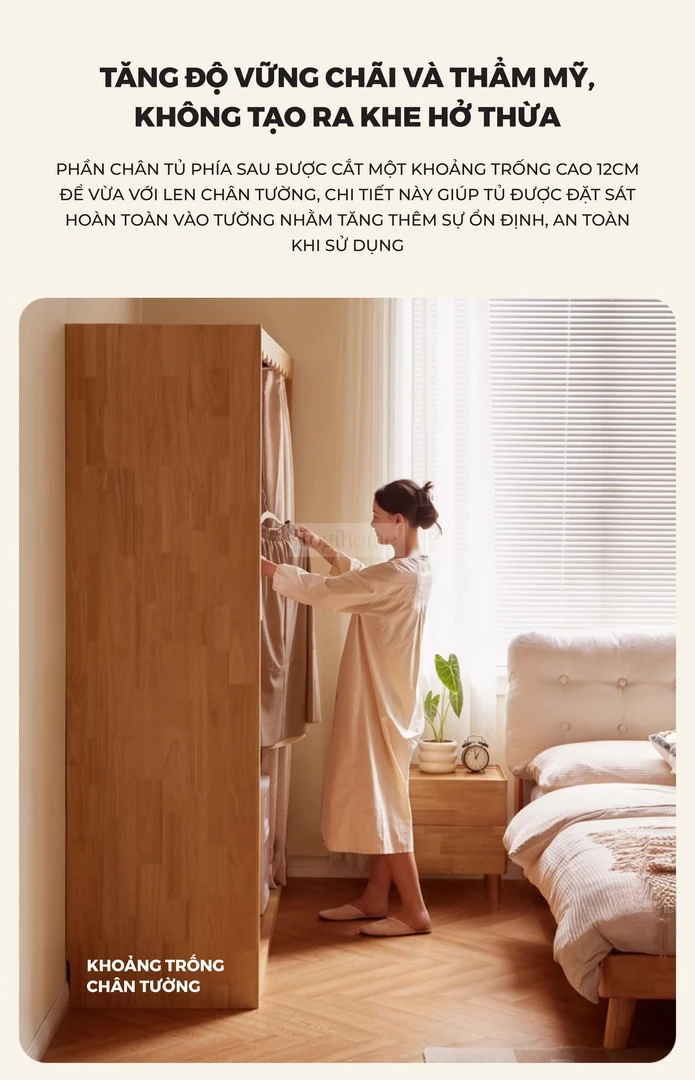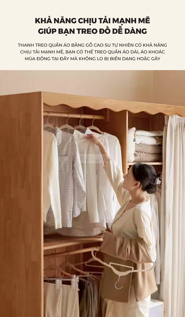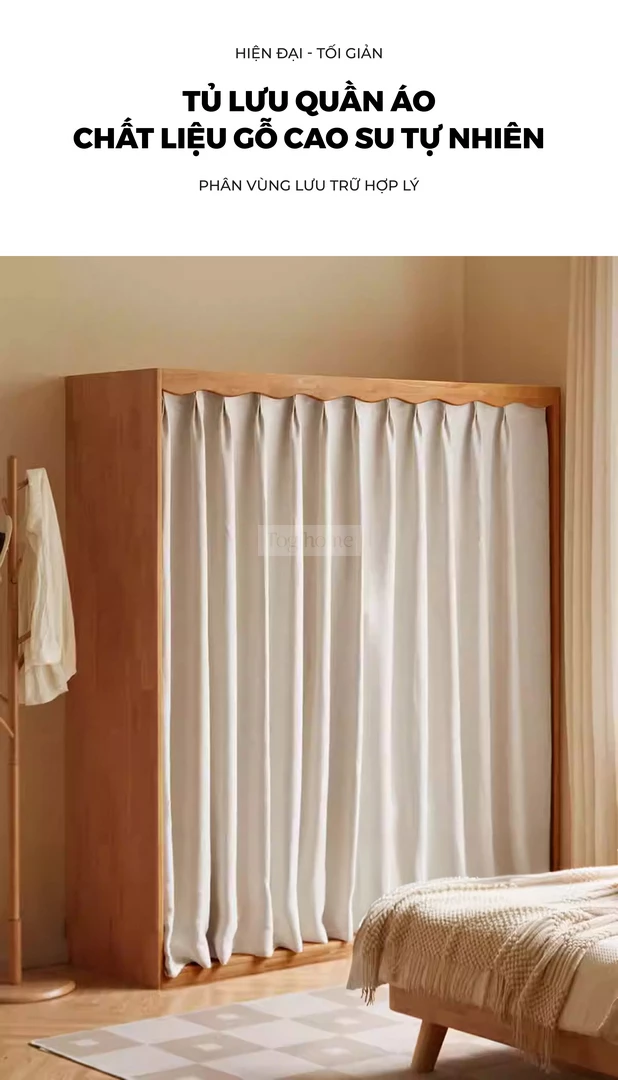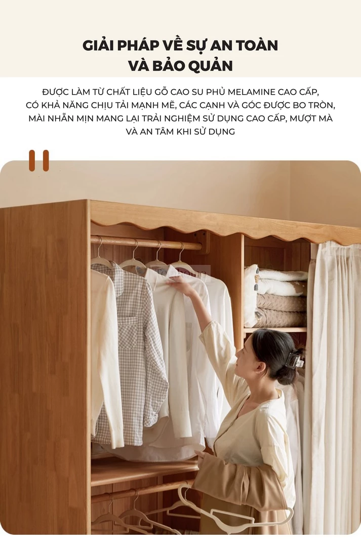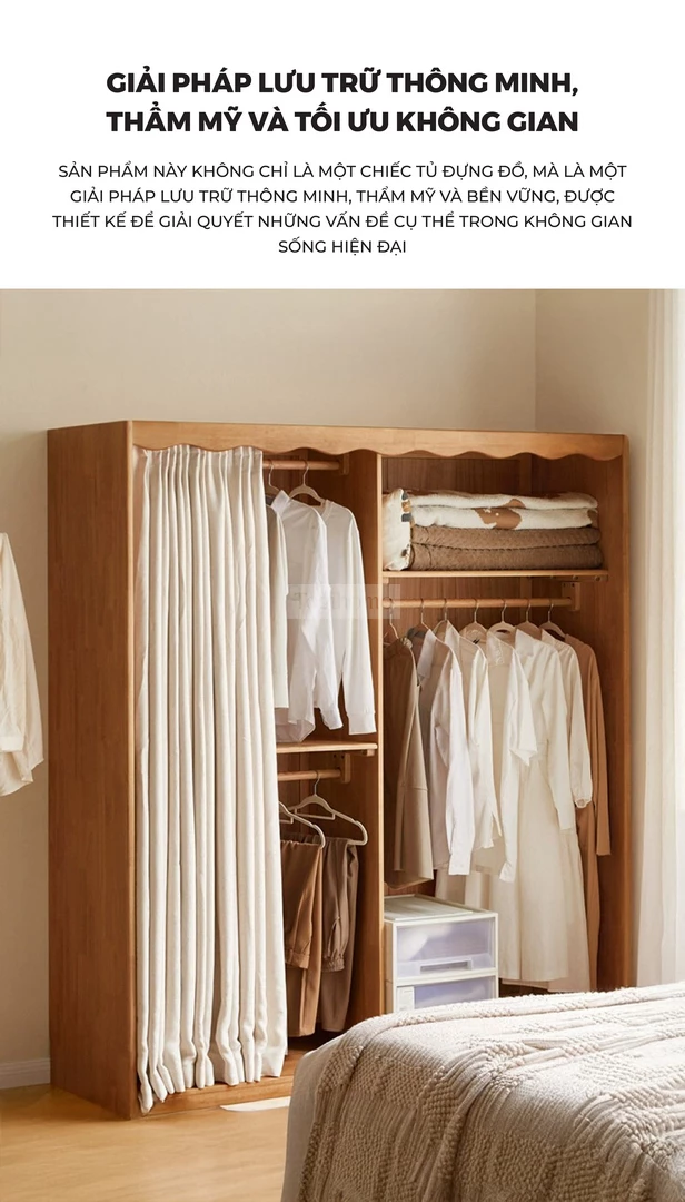 Tủ Quần Áo Gỗ Tự Nhiên CV021 được chế tác từ gỗ cao su tự nhiên, mang lại sự chắc chắn, bền bỉ và an toàn cho sức khỏe. Thiết kế thông minh với nhiều khu vực lưu trữ: thanh treo áo có thể điều chỉnh, ngăn xếp chồng, khu vực treo áo dài rộng rãi, giúp sắp xếp quần áo gọn gàng và ngăn nắp. Phần rèm vải dày dặn đi kèm có khả năng chống nhăn, chống mài mòn, đồng thời chặn ánh sáng, bảo vệ sự riêng tư tối đa. Với phong cách tối giản hiện đại, CV021 không chỉ là giải pháp lưu trữ tiện lợi mà còn tạo điểm nhấn ấm cúng và sang trọng cho phòng ngủ gia đình.