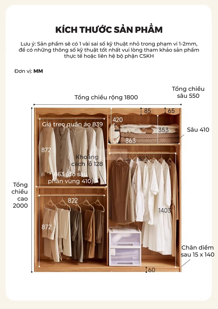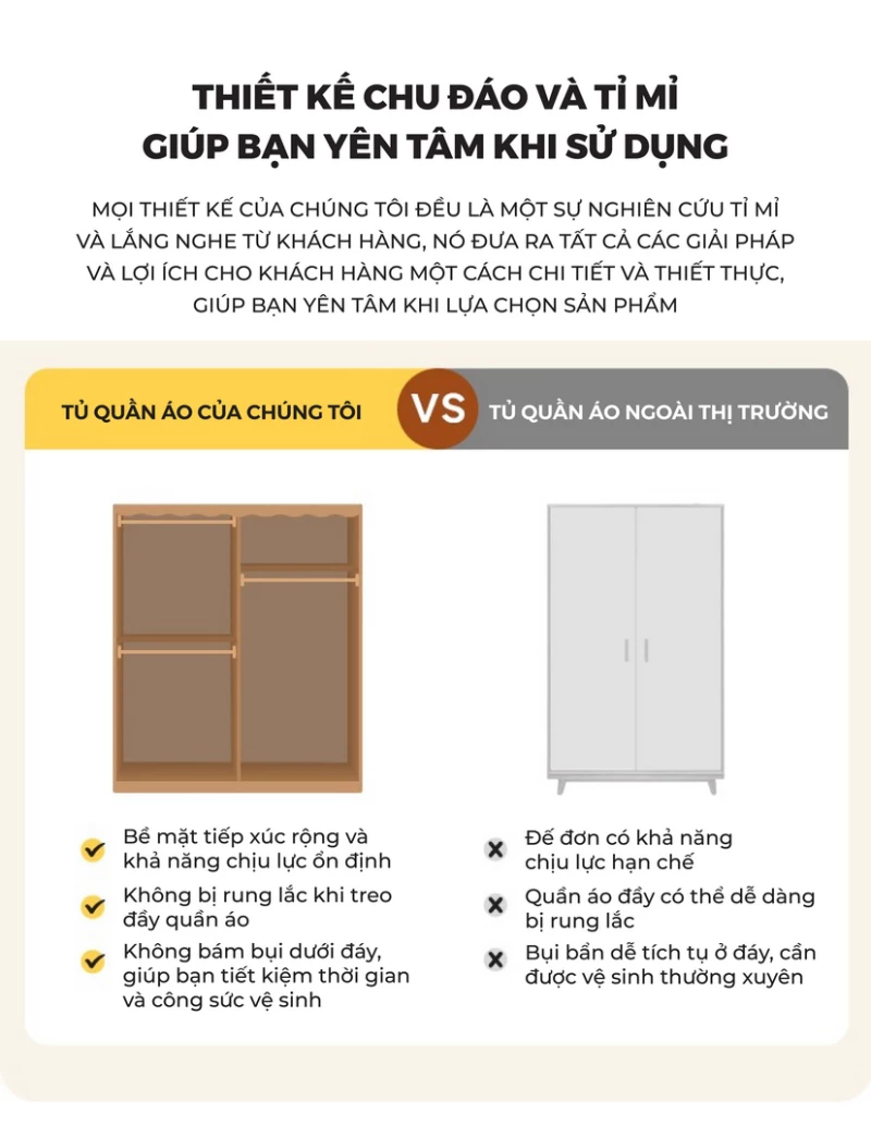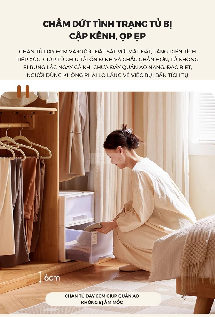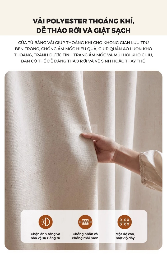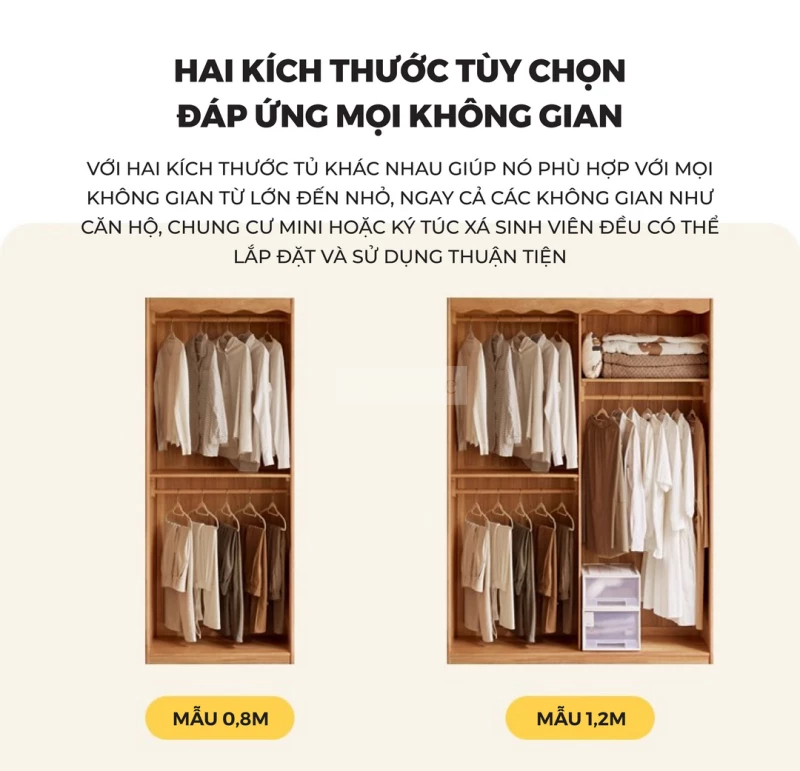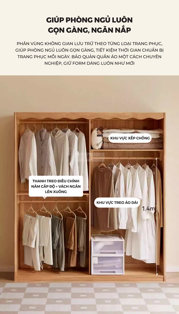 Tủ Quần Áo Gỗ Tự Nhiên CV021 được chế tác từ gỗ cao su tự nhiên, mang lại sự chắc chắn, bền bỉ và an toàn cho sức khỏe. Thiết kế thông minh với nhiều khu vực lưu trữ: thanh treo áo có thể điều chỉnh, ngăn xếp chồng, khu vực treo áo dài rộng rãi, giúp sắp xếp quần áo gọn gàng và ngăn nắp. Phần rèm vải dày dặn đi kèm có khả năng chống nhăn, chống mài mòn, đồng thời chặn ánh sáng, bảo vệ sự riêng tư tối đa. Với phong cách tối giản hiện đại, CV021 không chỉ là giải pháp lưu trữ tiện lợi mà còn tạo điểm nhấn ấm cúng và sang trọng cho phòng ngủ gia đình.