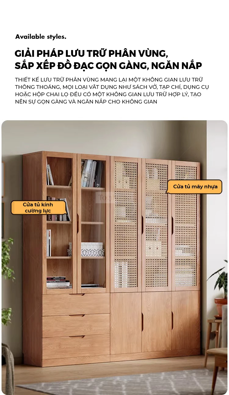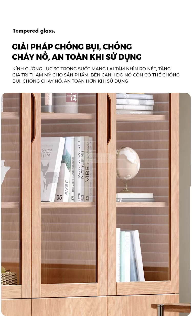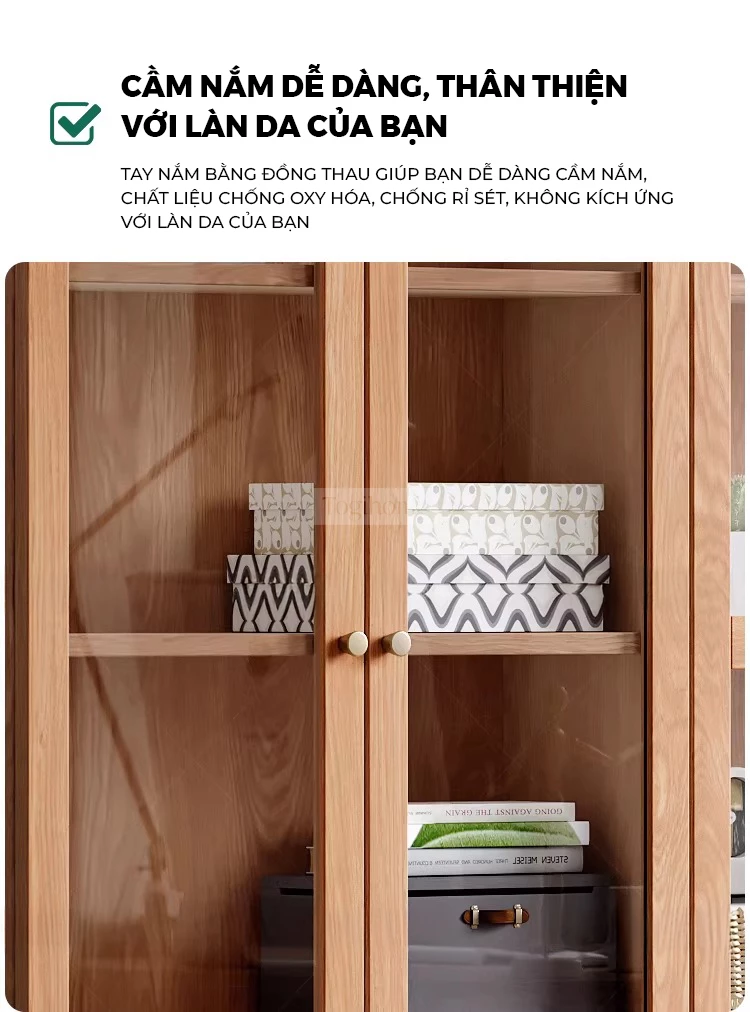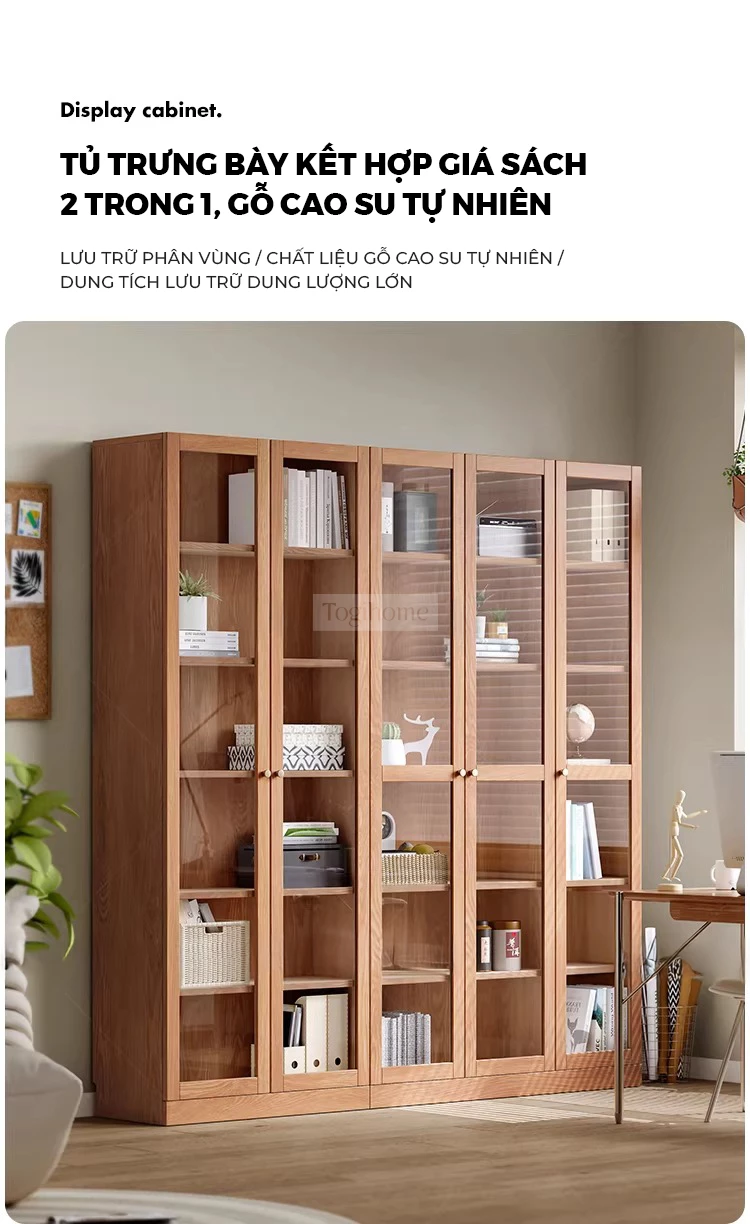 Tủ Sách Kính Gỗ Cao Su Tự Nhiên Togihome TS450 – 4 Cánh Kính, Tủ Trưng Bày Phòng Khách Cao Cấp